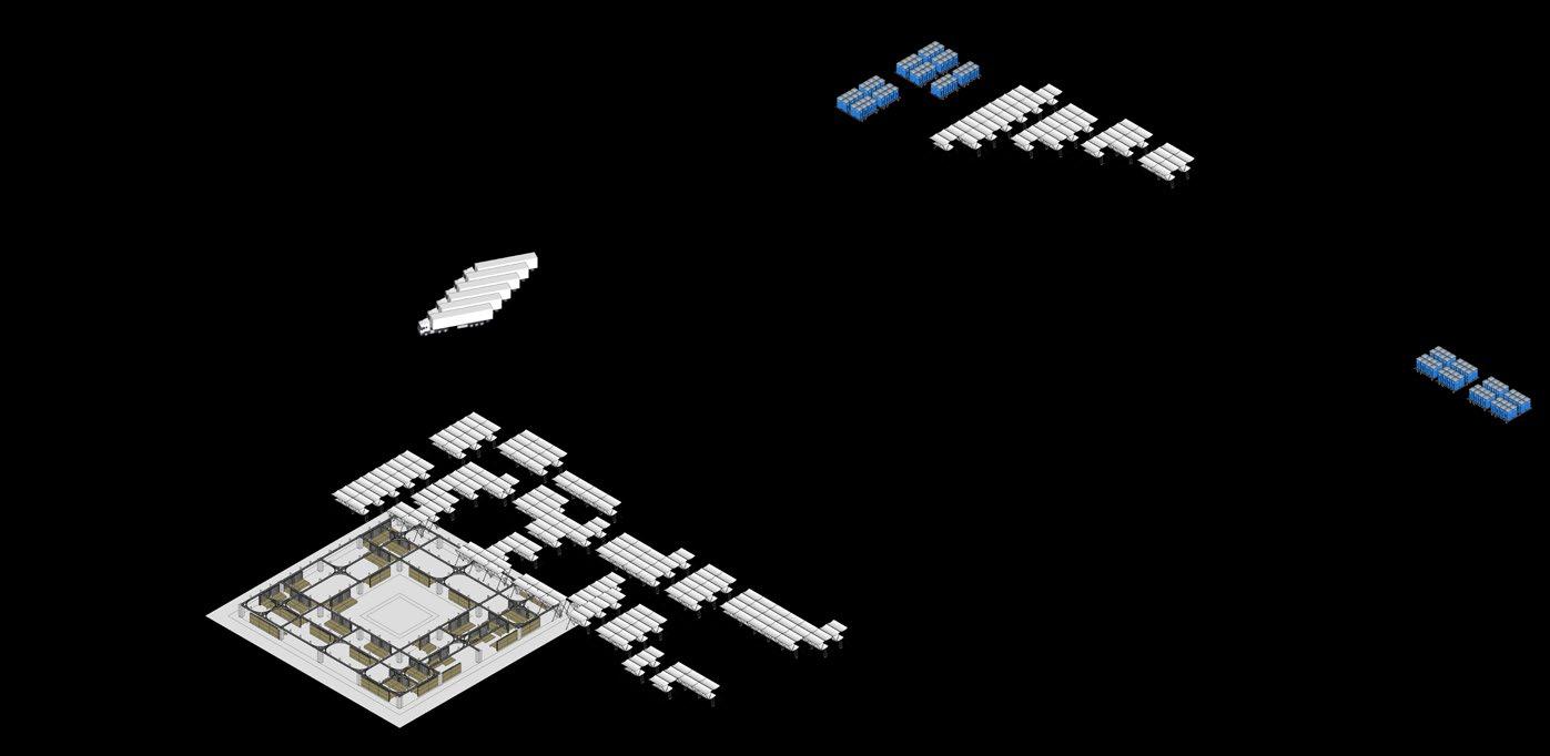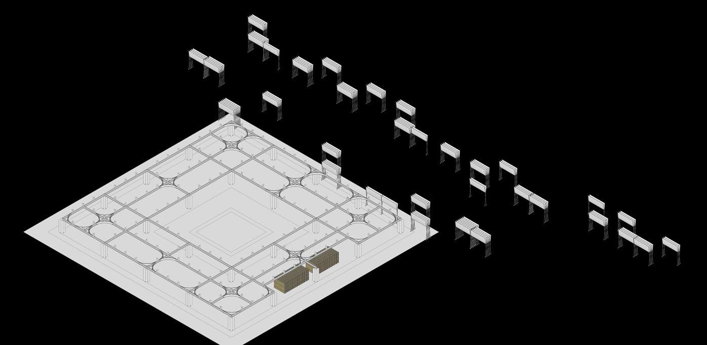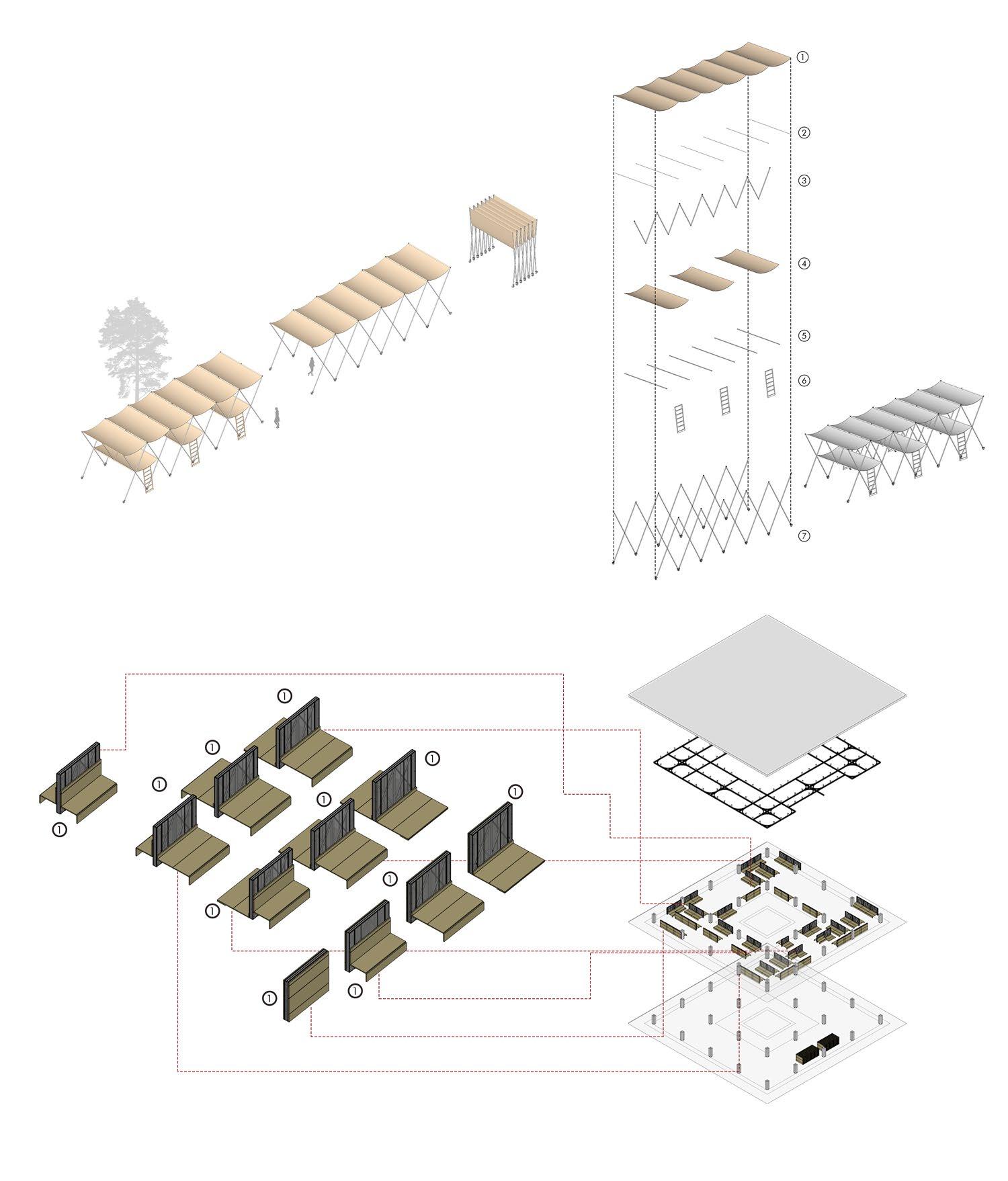 The diagram below illustrates the various configurations of the movable, modular wall system, which adapts to multiple functions. It can transform into a bench, creating a vibrant social space for seating; an extended platform for market vendors to display their produce, with additional storage underneath; or a low-lying platform for the Wari procession, offering suitable sleeping and resting spaces.