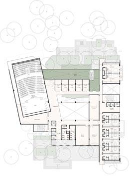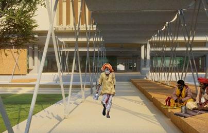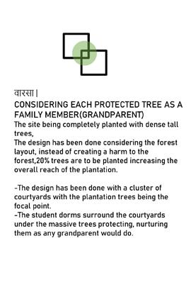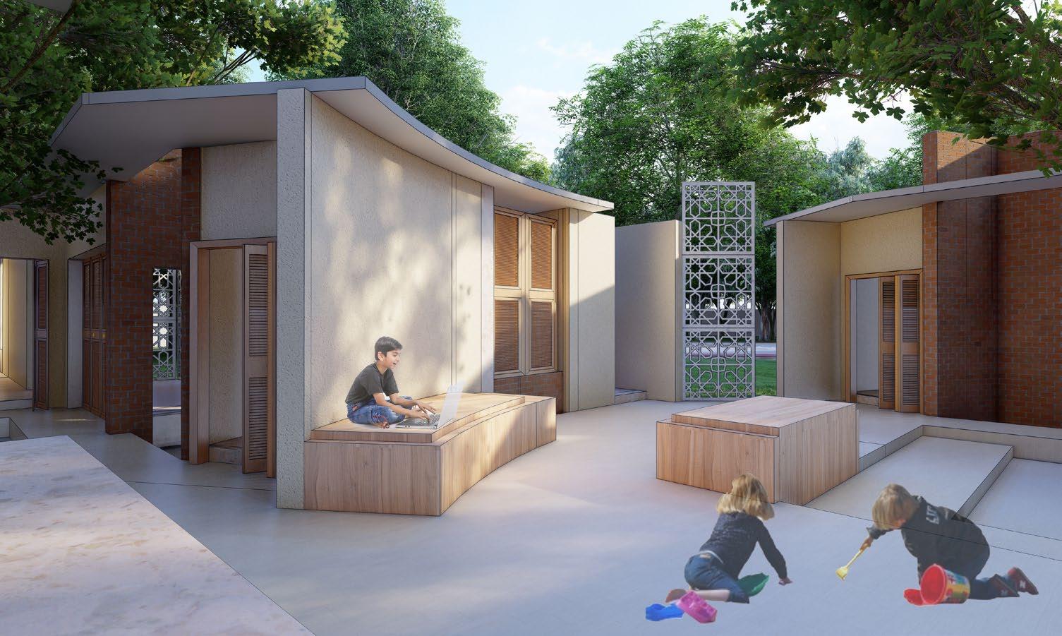 OPEN COURTYARDS WITH THE ELDERLY MEMBERS OF THE FAMILIESTHE TREES CREATE A VARIED SPACE SHARED BY TWO DORM ROOMS CREATING A SCOPE FOR INTERACTION AND GROWTH.