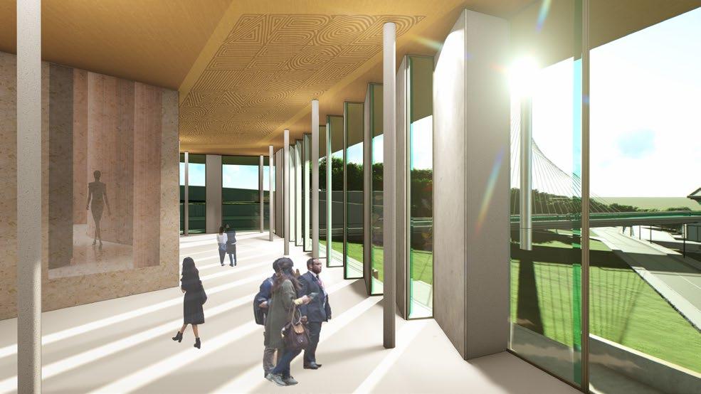 Envisioning a city intersection with integrated transit systems, transit hubs connecting central business districts (CBDs) and the airport, and tech-based industries on the horizon.