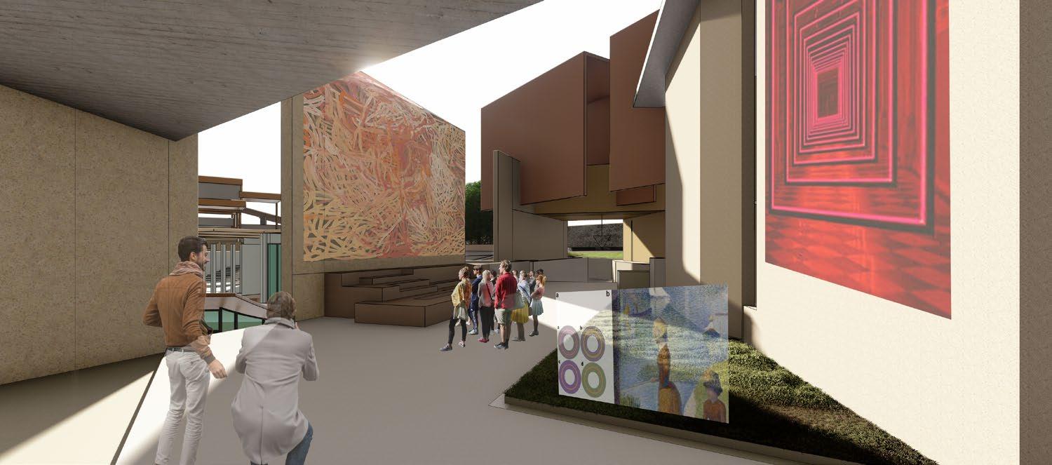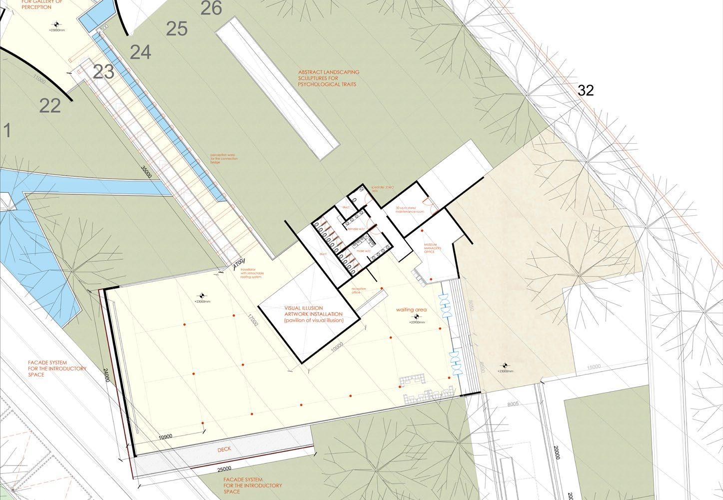 The introductory space is designed for orienting visitors to the museum and its galleries, emphasizing the mutual connection between psychology and art. This area features screens, panels, and artworks to aid in the orientation process. Additionally, it includes provisions for restrooms, waiting areas, and a manager’s cabin.