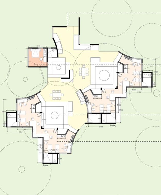 ENTRANCE LEADS TO THE COMMON LIVING SPACES ALONG WITH A SERIES OF COURTYARD CLUSTERS THAT CAN BE UTILIZED IN A VARIETY OF WAYS .the open kitchen creates an interesting space for the children to indulge in cooking their meals along with their mother. Dining spaces are spread around near the courtyards as an open layout. ROOM FOR S.O.S MOTHERTHE SOS MOTHER CAN SLEEP ALONG WITH BABES OR SMALL KIDS WHO NEED SPECIAL CARE