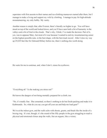 superstars with first ascents to their names and ice-climbing maneuvers named after them, but I manage to make a living and support my wife by climbing. I manage to pay for high-altitude mountaineering, my only hobby. My vanity. Another reason is simply that, after Everest, there’s literally no higher to go. You will have stood on top of the world and looked down, and you’ll have seen both a bit of humanity in the valleys and a bit of God in the clouds. That’s why, I think, I’ve made the decision. Part of it, yes, was to appease Mary, but most of it was because I wanted to end my mountaineering career on the highest possible note, in the best shape, with the best track record. After I claw my way up 29,029 feet like Sir Edmund Hillary before me, there’s nothing else worth doing.