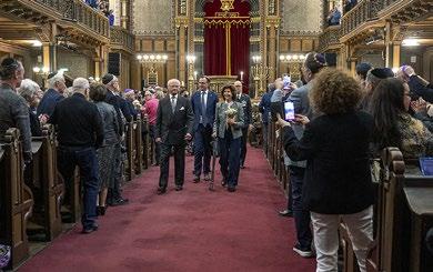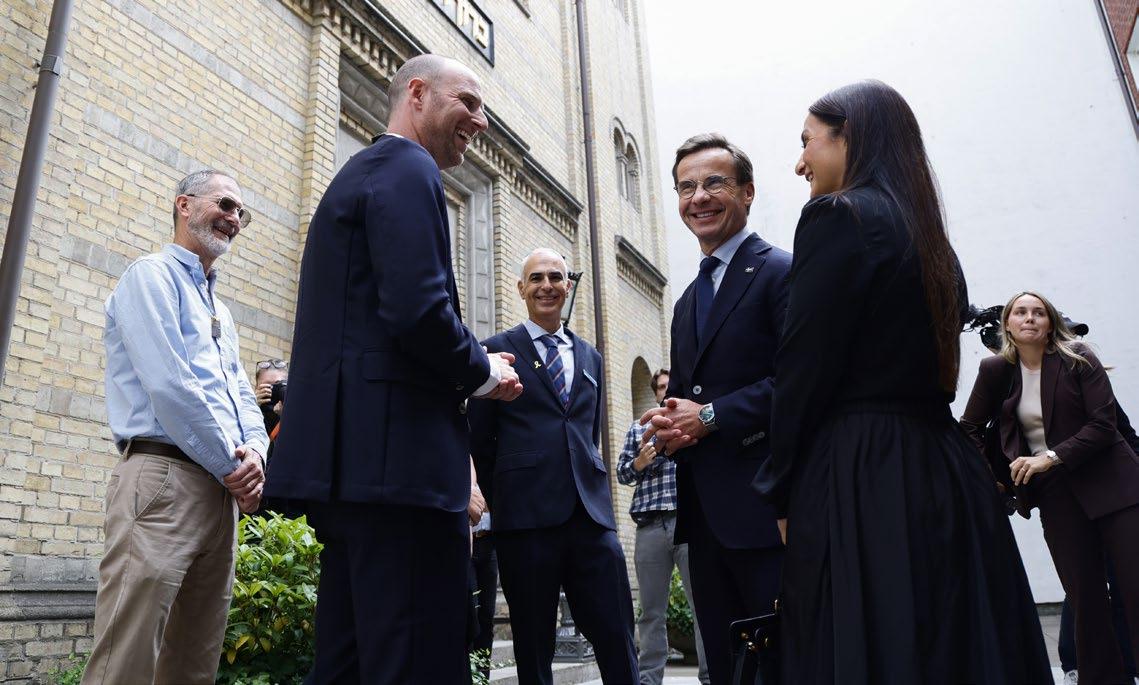 T v: Kung Carl Gustaf och drottning Silvia (här med Aron Verständig, Judiska centralrådets ordförande) närvarade vid en jubileumskonsert i maj i Stockholms stora synagoga. Statsminister Ulf Kristersson var en av talarna (t h). Foton: Stefan Jerrevång/TT
