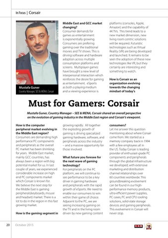 Must for Gamers: Corsair Mustafa Guner, Country Manager – SEE & MENA, Corsair shared an overall perspective on the evolution of gaming industry in the Middle East region and Corsair’s viewpoint. How is the computer peripheral market evolving in the Middle East region? Consumers are demanding high performance PC components and peripherals as the overall PC market has been shrinking for years. Middle East market, mainly GCC countries, has always been a region with big potential market for us. In last couple of years, we experienced considerable increase on high end PC components market which Corsair is known for. We believe the next step for the Middle East is gaming peripherals(keyboards, mouse and headset) market. There is a lot to do in the region in this fast growing market. How is the gaming segment in 20