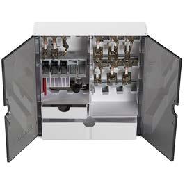 A praktikus BERNINA tartozékos dobozban tárolhatja a talpakat, orsókat, tűket és egyéb eszközöket. A tartozékos dobozt tarthatja a varrógép mellett az asztalon, vagy akár fel is szerelheti a falra.