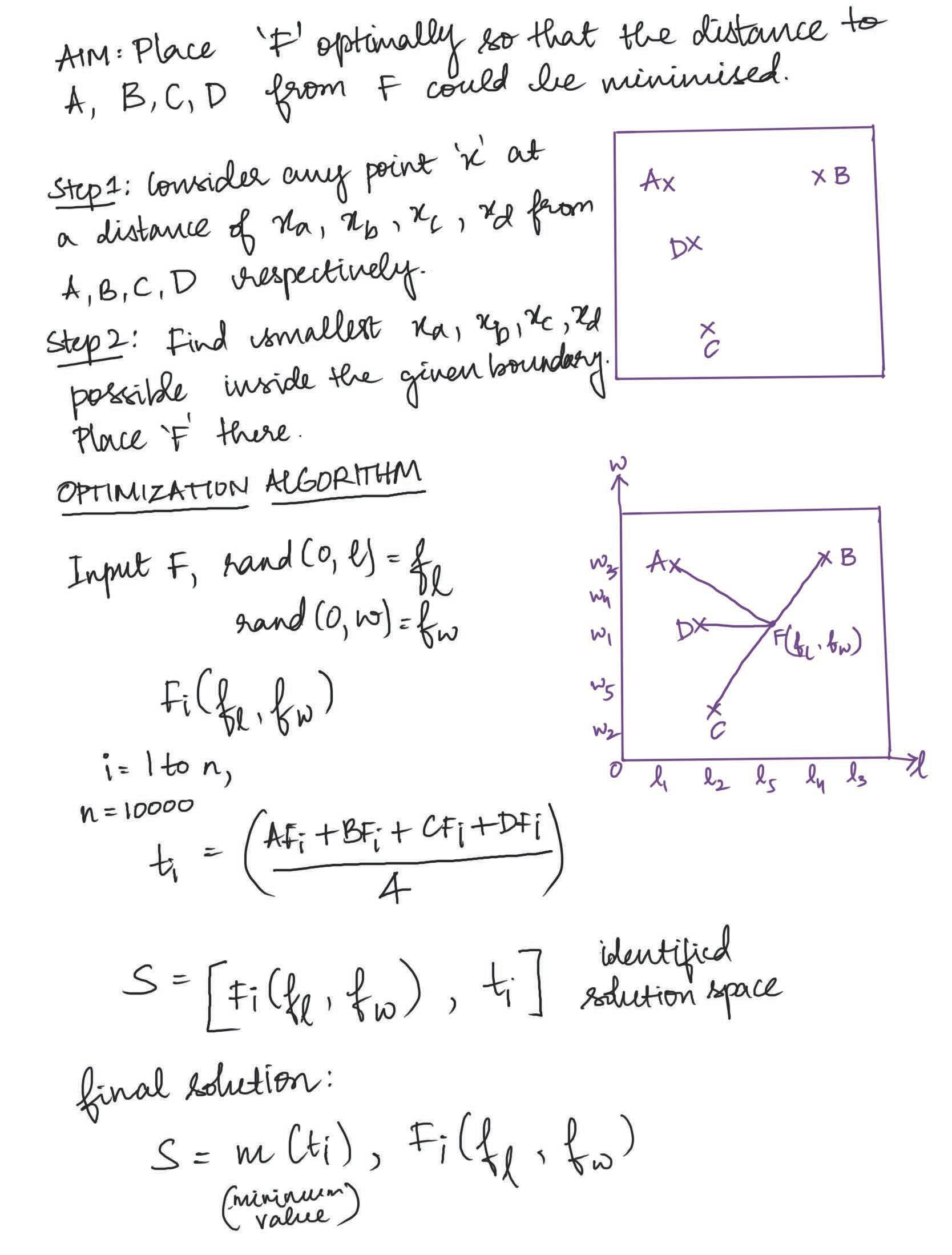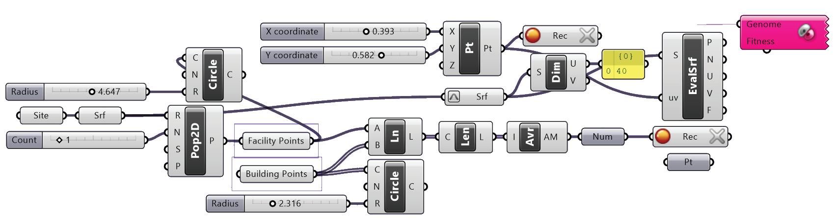 In any given site context with existing facilities, the ideal location to place a new facility is evaluated here by using python scripting as well as the galapagos solver.