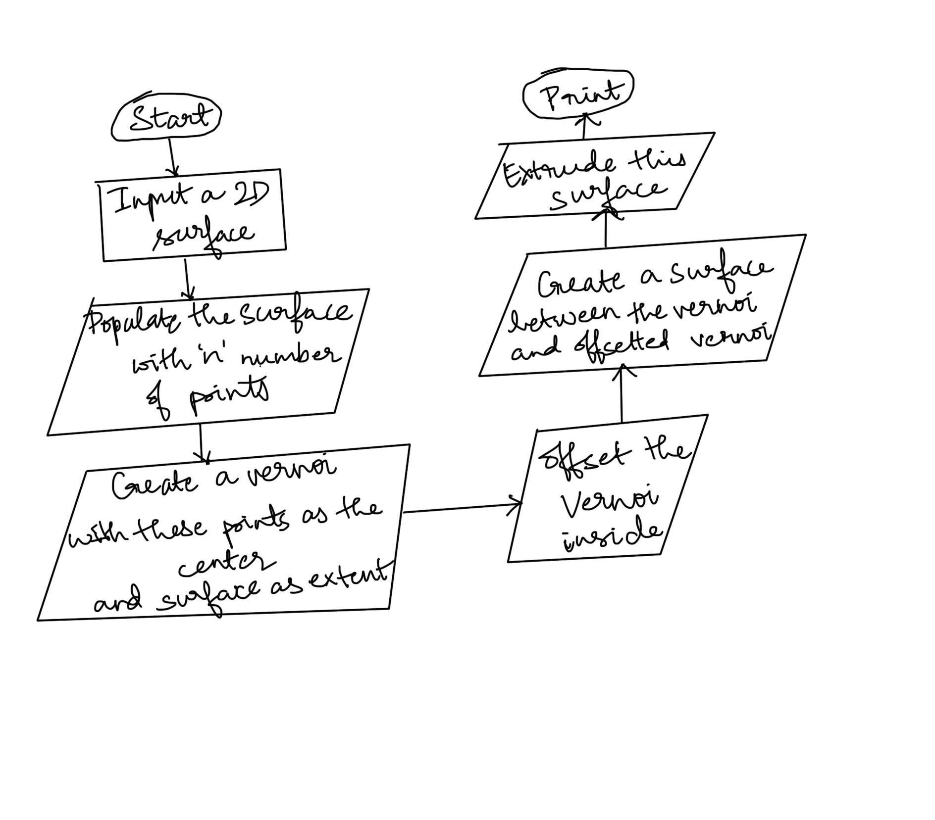 A surface is created along a plane and then populated with required numbers using the Vernoi tool. A facade skin is then developed by creating offsets of the Vernoi.