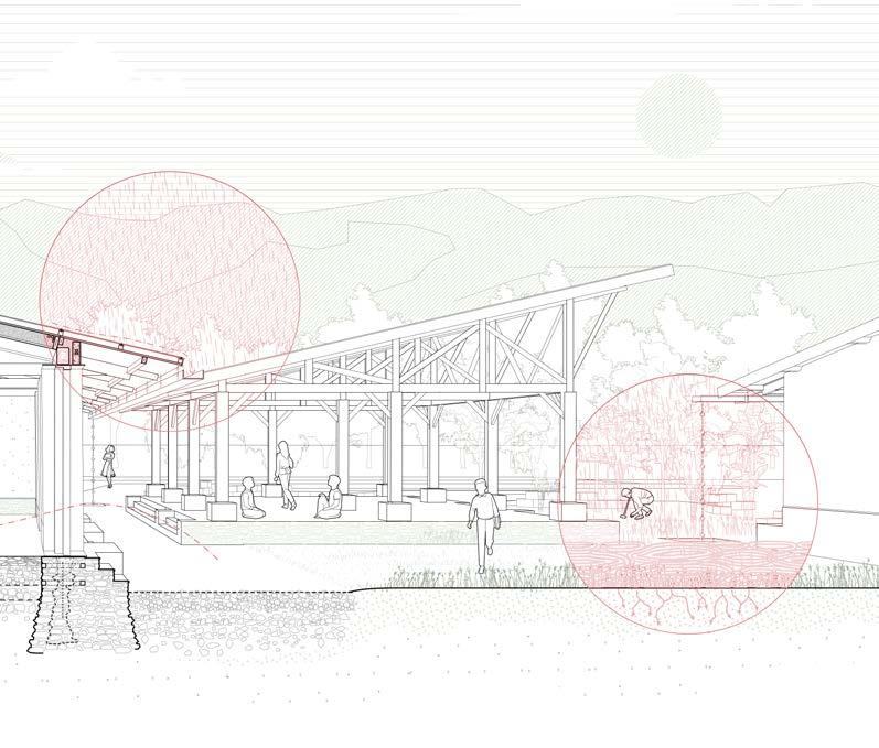While the school can access existing utility networks, passive systems reduce dependency. Wastewater is treated via an enclosed Anaerobic Baffled Reactor and a free-standing vertical flow constructed wetland, creating a hygienic, low-maintenance solution, that also irrigates the orchard while educating students on water cycles. Rainwater harvesting collects runoff from the roof, filtering it through the aforementioned system using Biosand filters that removes bacteria and turbidity. The result is clean, safe water for the school with minimal maintenance yet community-scale impact.