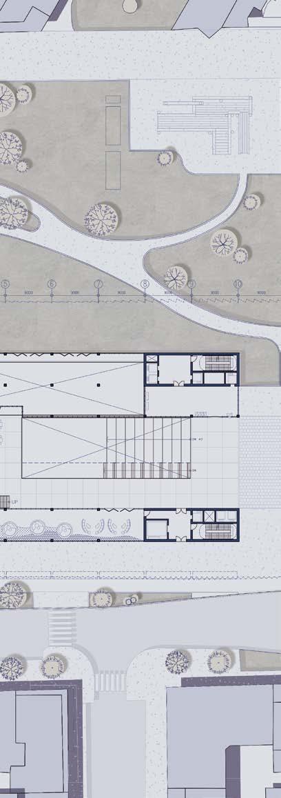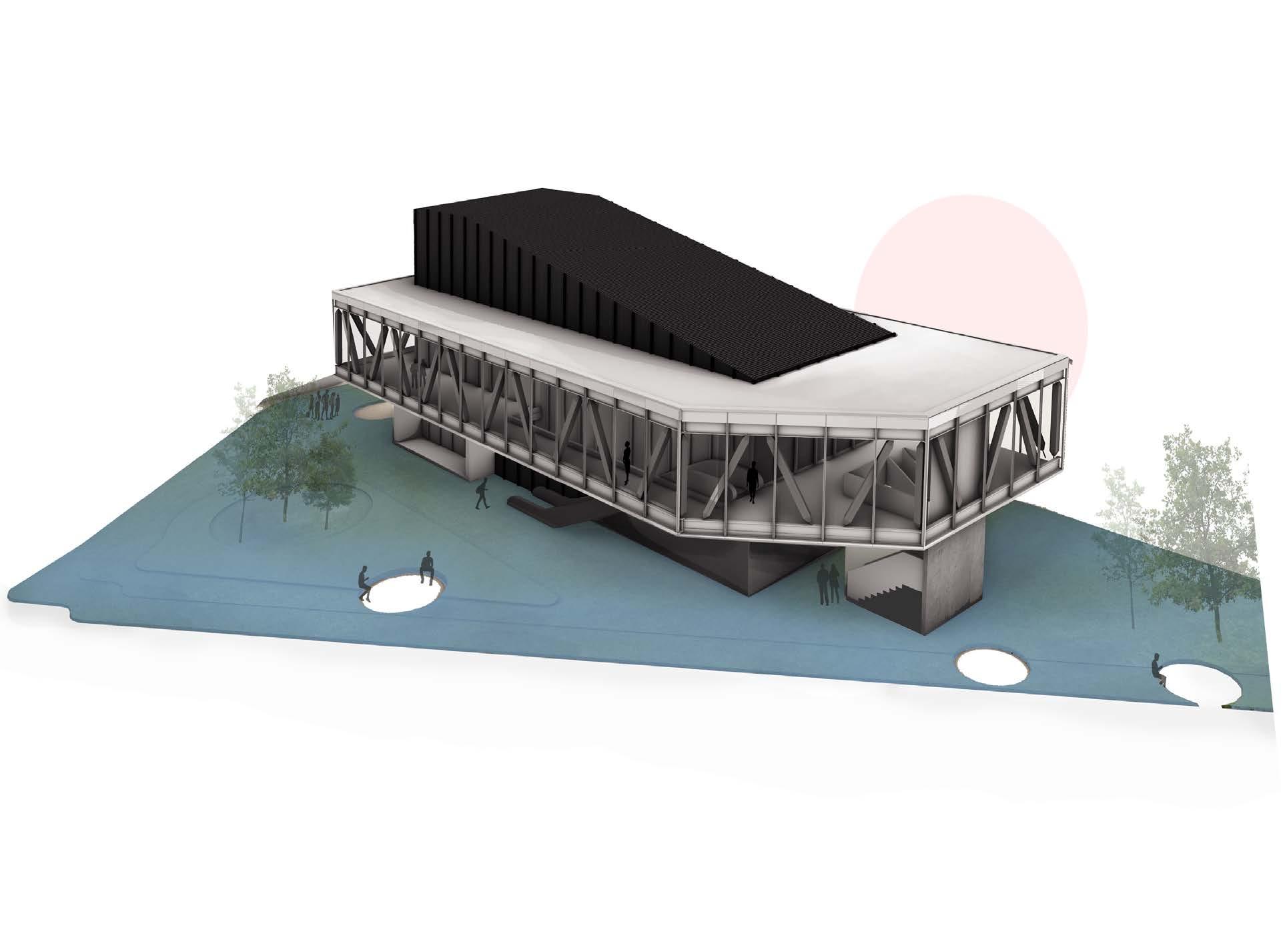 The ground floor of the library has a different spatial quality in contrast to the suspended library block in order to integrate the boundaries of the library with the immediate context by having a public sunken plaza and physical as well as visual connection to the park on the west.