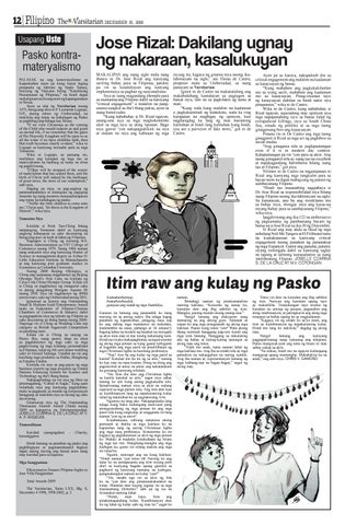 Jose Rizal: Dakilang ugnay ng nakaraan, kasalukuyan MAKALIPAS ang isang siglo mula nang ibuwis ni Dr. Jose Rizal ang kaniyang sariling buhay para sa Filipinas, patuloy pa rin sa kasalukuyan ang kanyang impluwensiya sa pagbuo ng nasyonalismo. Siya ay isang magandang ehemplo para sa mamamayang Filipino dahil sa kaniyang “critical engagement” o malalim na pangunawa tungkol sa iba’t ibang paksa, ayon sa isang historyador. “Kung nabubuhay si Dr. Rizal ngayon, unang-una siya sa mga magkokomento ukol sa mga isyu sa ating lipunan. Bago niya gawin ‘yon nakapagsaliksik na siya at inalam na niya ang kabuuan ng mga