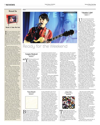 pon arrival at the Union we were welcomed by a mime. I say ‘a mime’ – he might have simply been a mute yet hilarious sex offender merrily roaming outside the Union without the consent of the organisers. It’s surprisingly easy to praise an entertainer whose opening gambit is pretending to molest your date. ‘An American in Paris’ was the theme of the night, reflected only in the fi lm silently playing on a telly in the corner, but the Valentine’s schmaltz, with a saccharine shade of pink soaking into everything in the damn building, was perfect. Ents Officer Anna Harper and her team had clearly invested a huge amount of effort into the whole production, and the atmosphere they created was ideal for the opening ball of the year. Entertainments were generally good; the apparently telekinetic illusionist who fl ipped playing cards along the floor without touching them was a highlight, as were the ever-superb Footlights James Moran and Lucien Young. Ballerina Nina Ellis, taking to the Union floor was a unique and especially enjoyable act which will no doubt stand out throughout the Ball memories of May Week. For the most part, however, the best acts were inexplicably relegated to the small room adjacent to the bar, whilst the main chamber was occupied by less compelling performances, culminating in the eminently uninteresting threehour Ragged Army marathon. Food and drink was disappointing – the promo material kept schtum about the four-drink limit (and they still ran out of champagne), and food choices were limited to the hog roast and meat/ cheese table, but on a positive note there was plenty to go around. Altogether a success, and all for a modest £45. Not an event so memorable as to set the standard, but a strong start to the season nonetheless. DAVID PEGG The title-track unfolds with a peculiar timelessness: a female vocal is cut-up with all the noughties wizadry of Prefuse 73, but ends up sounding just as swirling as Orbital’s 1992 classic ‘Halcyon’. Similarly paradoxical: single ‘Love Cry’ loops a half-bar vocal sample over the thickest of Mylo basslines, and yet both sound as gorily organic as any of Hebden’s early works. Speaking of which – the allusion to Rounds in the electric guitar of closing track ‘She Just Likes to Fight’ is not for the emotionally fragile. If you’ve also been listening to Four Tet for the best part of a decade, and not slept enough in the last seven days, the harmonic that pings out at 2:18 will make you cry, too. We waited five years for this. A star for every year. JOE SNAPE