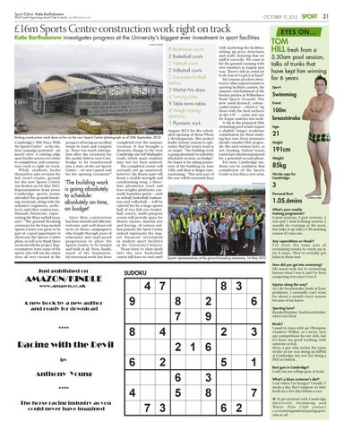 with marketing the facilities, setting up price structures and really ensuring that we staff it correctly. We want to hit the ground running with new members in August next year. There’s still an awful lot to do, but we’ve got it in hand.” Mr Lemons also drew attention to other improvements to sporting facilities: namely, the summer refurbishment of the hockey pitches at Wilberforce Road Sports Ground. The new sand-dressed, colourcoded surface – which is “up there with the best surfaces in the UK” – came into use for league matches last week. A dip in the proposed 50m swimming pool would require a slightly longer academic commitment for those studying here now. Keen swimmers should consider PhD proposals: this next venture lacks, as yet, funding. Indoor tennis courts have also been proposed for a potential second phase. For now, Cambridge students can be confident that completion of the Sports Centre is less than a year away.