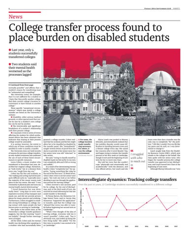 normally possible” and airms that a student’s reason for transferring must be “substantial and compelling”. he University notes, for example, that it is not suicient for a student to “claim that they prefer another college, ind their current college’s location inconvenient or have friends in another college.” hree speciic “exceptional circumstances” which may justify a college transfer are listed on the University’s website: ● Disability, other serious medical grounds, or other special need that cannot be met by a student’s own college but can be met by another. ● he irretrievable and signiicant breakdown of a student’s relationship with their present college. ● a traumatic event or series of events afecting the student for which professional advice has been obtained that indicates that staying at their present college would be untenable. it is unclear, however, the extent to which any of these conditions must be satisied in order to justify a transfer. he University does not hold records of reasons for previous college transfers, so only student testimony has conirmed the use of each of these listed circumstances in speciic instances. Leora Cohen, a music student who transferred to newnham last year, described her original college, homerton, as “truly lovely,” but at a distance from town was “tough from day one.” Cohen has lat feet and scoliosis, so “the walking and cycling started became quite diicult early on,” especially since the majority of her music events took place in the city centre. She said, “i was constantly in physical pain and soon my mental health started deteriorating.” “i loved homerton but was never really there.” Long days in town were expensive in terms of bus transport and meals out, and did not provide private places for music practice and studying. Furthermore, Cohen struggled to establish strong friendships in college, losing contact with many people she had known prior to arriving in Cambridge. She spoke to her senior tutor, as the University’s college transfer guidance suggests, but the irst meeting “wasn’t too helpful,” though further meetings were arranged. all the while, Cohen said, her mental health was declining.after speaking to a student who had successfully been