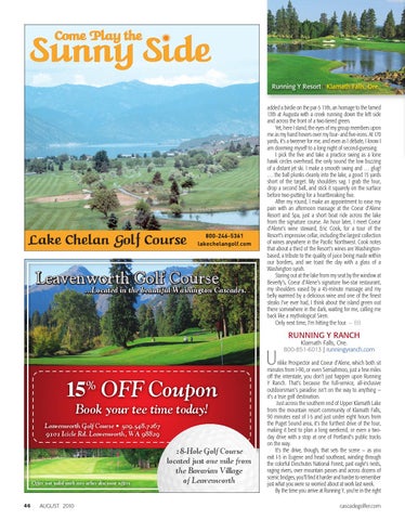 nlike Prospector and Coeur d’Alene, which both sit minutes from I-90, or even Semiahmoo, just a few miles off the interstate, you don’t just happen upon Running Y Ranch. That’s because the full-service, all-inclusive outdoorsman’s paradise isn’t on the way to anything — it’s a true golf destination. Just across the southern end of Upper Klamath Lake from the mountain resort community of Klamath Falls, 90 minutes east of I-5 and just under eight hours from the Puget Sound area, it’s the furthest drive of the four, making it best to plan a long weekend, or even a twoday drive with a stop at one of Portland’s public tracks on the way. It’s the drive, though, that sets the scene — as you exit I-5 in Eugene and head southeast, winding through the colorful Deschutes National Forest, past eagle’s nests, raging rivers, over mountain passes and across dozens of scenic bridges, you’ll find it harder and harder to remember just what you were so worried about at work last week. By the time you arrive at Running Y, you’re in the right cascadegolfer.com