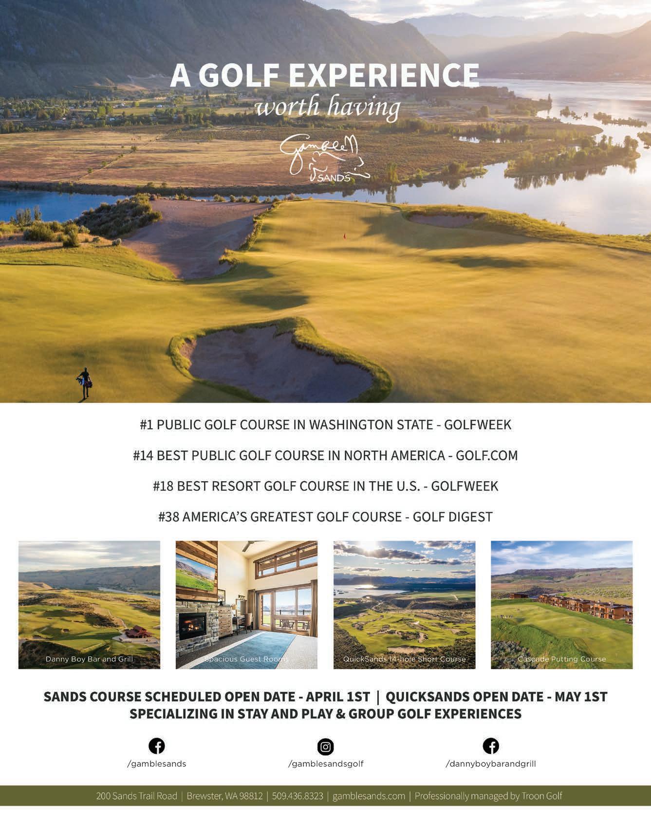 today. You find all this information in this issue and on CascadeGolfer.com. We are ready to go in 2022. Keep up with us online and we will see you here and on the links this spring and summer. THANK YOU for standing with us during these interesting times and, as always, — TAKE IT EASY. APRIL Corona Premier Shootout • Pages 20-21 APRIL Publisher Pitch Editorial • Page 4 cascadegolfer.com The Corona Premier Happy Hour on Saturday evening at the Cascade Putting Course is a great way to chill with new friends and old. SHORT GAME Corona Premier Gamble Sands Shootout returns July 23-34 register today ow could we not go back and do it all again? Last summer’s Corona Premier Shootout at Gamble Sands was one of the most memorable events we’ve ever staged, and the consensus for the 112 par ticipants was it would need to be repeated. So that’s exactly what we’re doing. The event will return July 23-24 to one of the state’s most beloved courses for two days of unbelievable fun, competition, and more laughs than you can shake a 48-inch driver at. David McLay Kidd’s awesome Sands Course has been one of our favorites since the day it opened nearly eight years ago, mixing firm, linksy golf on amazing fescue turf with amazing views over the Columbia River. We can’t get enough of it and everyone that entered in 2021 said much the same. On both the Saturday and Sunday you experience 18 magical holes of a two-person Best Ball competition with Gross and Net divisions and extra prizes for KPs (4), long drive and straight drive. On Saturday evening, we’ll hang out on the wild Cascade Putting Course (also designed by McLay-Kidd) for Corona Premier Happy Hour and, of course, anytime that day you can take a spin round the incredibly entertaining Quicksands short course (designed by guess who) where anything goes be it bare feet, music, trash-talk and, yes, cold brew or two. Like 2021, we will prize out the top five teams daily in both Gross and Net, plus the top five overall in both divisions for the weekend. Thirty team prizes available plus Long Drive and Straight Drive daily and more clos est-to-the-pin competitions than you will be able to keep track of. Fee is $1,180 per team and includes the tournament entry and green fees, Saturday round at Quicksands, use of a cart, range balls, plus lunch on Saturday and Sunday. Lodging is available at the Inn but will go fast. Now go find a playing partner before you miss out on the best golf weekend of the year. Go to CascadeGolfer.com to register H CORONA PREMIER SHOOTOUT AT GAMBLE SANDS July 23-24, Gamble Sands Two-person best ball Saturday & Sunday Net and gross divisions Prize pool daily & total 4 KP’s, Long Drive, Straight Drive daily Saturday Corona Premier Happy Hour at Quicksands/Cascade Putting Course Go to CascadeGolfer.com to register YOUR $1180 TEAM FEE INCLUDES Greens fees, cart, range & lunch Saturday & Sunday plus Saturday afternoon/evening round at Quicksands. Enter to Win a Gamble Sands Twosome lay golf the way it was meant to be played, FUN. We are sending two of your to perhaps the most FUN course in the Northwest — Gamble Sands. Don’t forget to order the Tower of Tots for the post round! Enter to win today at CascadeGolfer.com. P Two Amazing Days of Golf at Gamble Sands Including an Evening on the New Quicksands Short Course SHOOTOUT GAMBLE SANDSAT JOIN US JULY 23-24 BEST GOLF WEEKEND OF THE YEAR! Two-Person Best Ball Net and Gross Divisions SPONSORED BYCONTACT: Simon Dubiel simon@cascadegolfer.com (206) 778-7686 REGISTER AT cascadegolfer.com 21APRIL 2022 Gamble Sands GC Brewster The Quicksands course is rollercoaster golf fun.