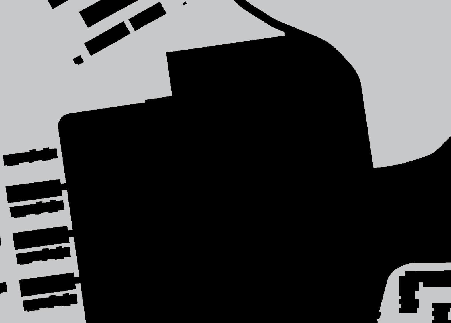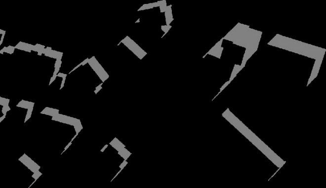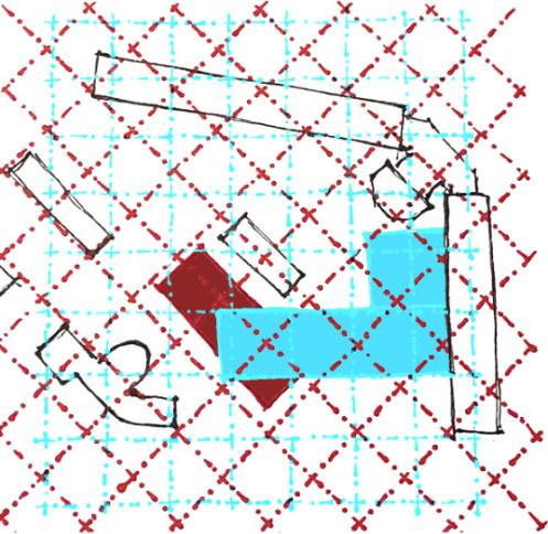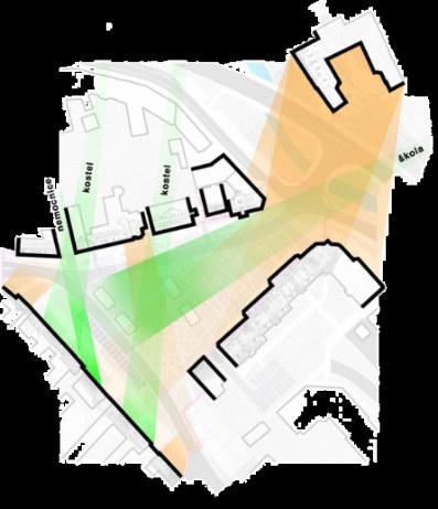 Prostorové úspořádání navrhovaných budovvycházejícíarespektujícípředem definovanéortogonálnísítě.