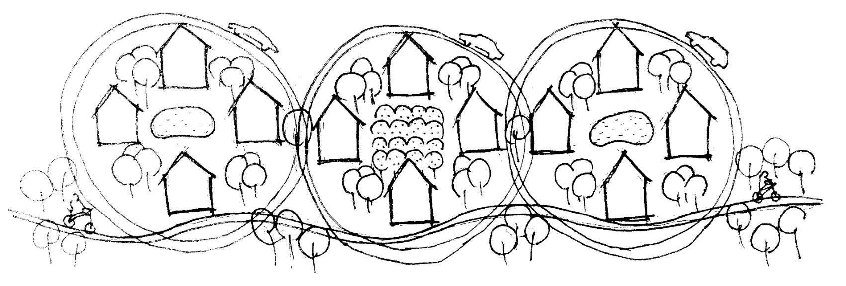Celý projekt se zakládá na třech základních krocích. Prvnímznichjeefektivnídopravnířešení,kterévychází z pravoúhlého uspořádání a přímého napojení na stávajícíkomunikace.Tímtozpůsobemcestyrozdělují územídočtyřzákladníchoblastí,kteréjsouurčenypro bydlení a rekreaci. Zástavba je pečlivě plánována v