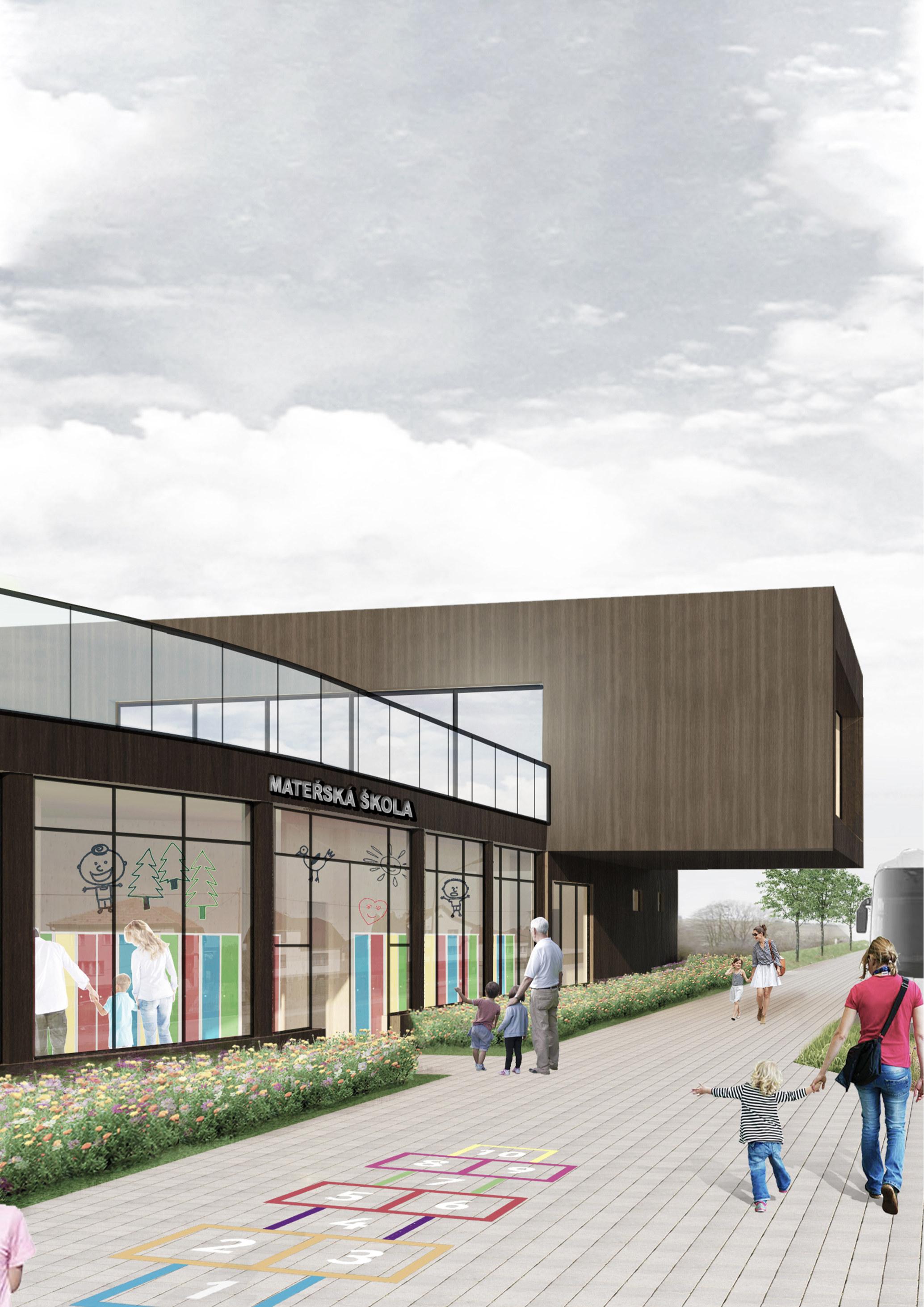 Stejnějakovestetickégymnasticejepoužívánastuha jež svým pohybem vytváří jedinečná gesta vyjadřující emoce či příběh, tak i tvar navrhované školky má být jakousi pomyslnou stuhou. Formou i uspořádáním vytvářístrukturovanýprostor.Vseverní-vstupní-části se nachází šatny, technické zázemí a jesle, a začátek chodbyvinoucíseskrzeceloubudovupodélvnitřního átria. Z této chodby jsou přístupné kanceláře personálu, kuchyně s jídelnou, dále jednotlivé třídy, které se můžou navzájem variabilně propojovat, či oddělovatdlepotřebpomocímobilníchpříček.Natřídy navazuje pódium s hledištěm kopírujícím rampu chodbydo2.NP,kdesenacházítělocvičnasmožností vstupunachráněnoustřešníterasu.