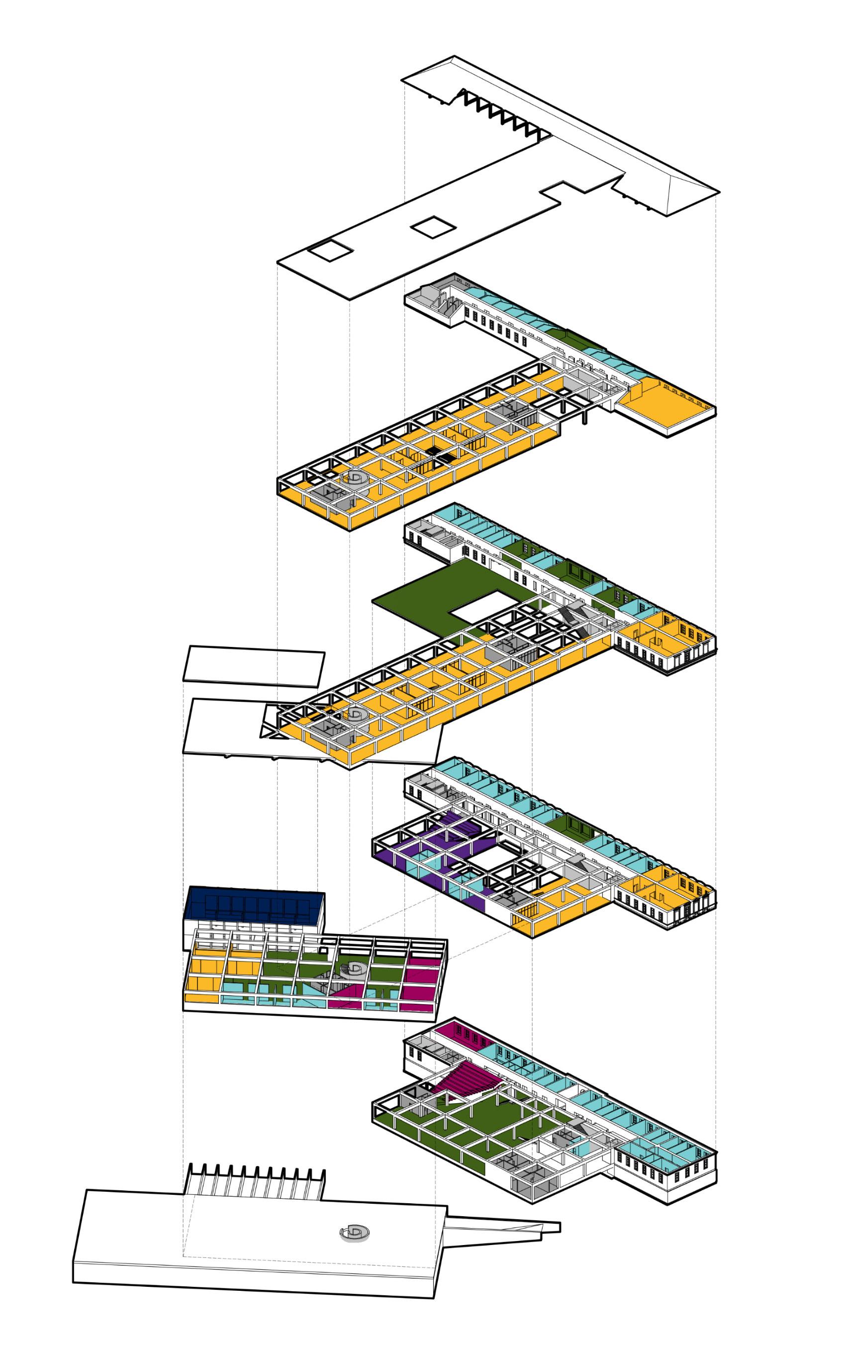 Základní prostorové uspořádání vychází z vytvoření dvou rastrů definovaných současnou zástavbou v areálu. Tyto rastry kolidují právě v místě navrhované budovy a rozrušují tak jednoduchou pravoúhlou koncepcizekterénávrhvychází.Přístavbasestáváze