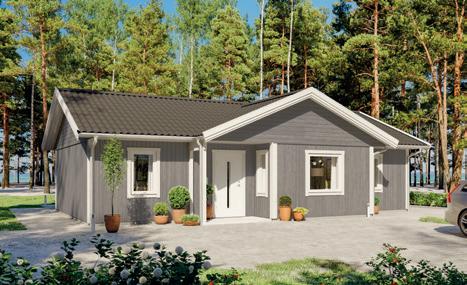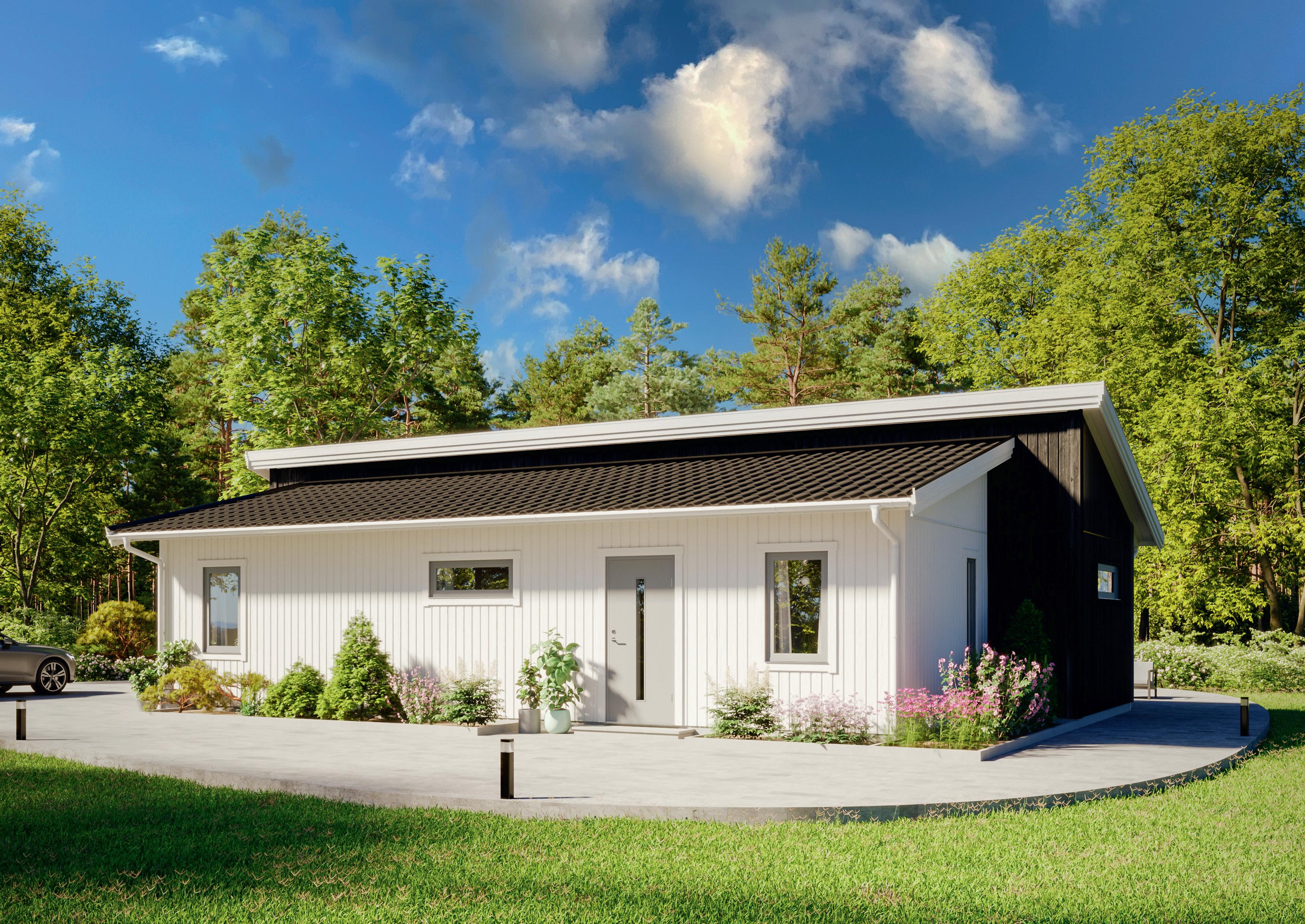 Effekt 74 är är en populär modell som utnyttjar alla boendeytor maximalt. Från den väderskyddade entrén kliver man direkt in i storstugan som tillsammans med det öppna köket blir en given samlingsplats att umgås i. Välj till ryggåstak för att skapa extra rymd och ljus till rummet. Med tre sovrum, WC och uteplats finns det inte mycket mer att önska av ett fritidshus.