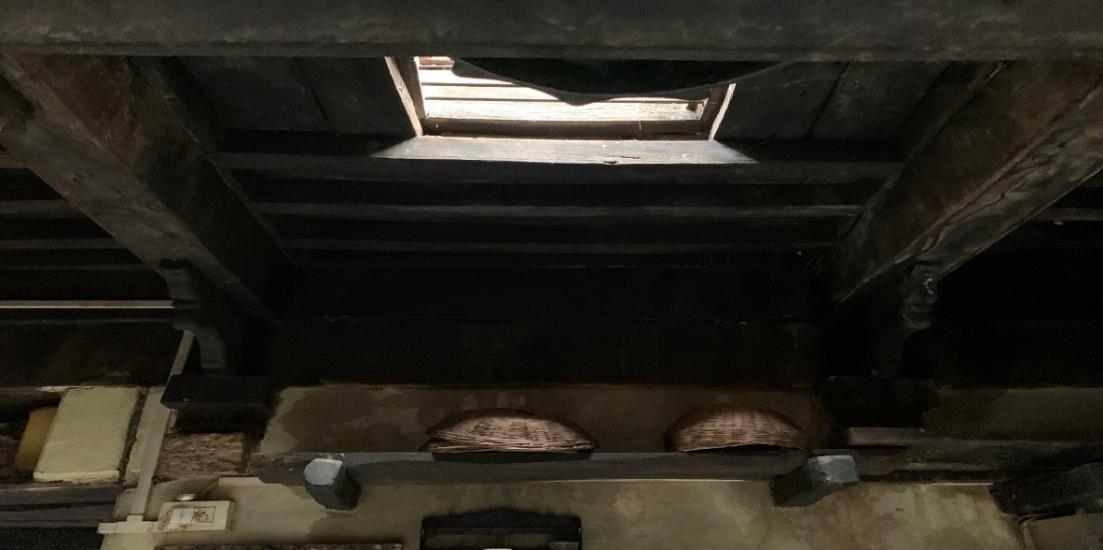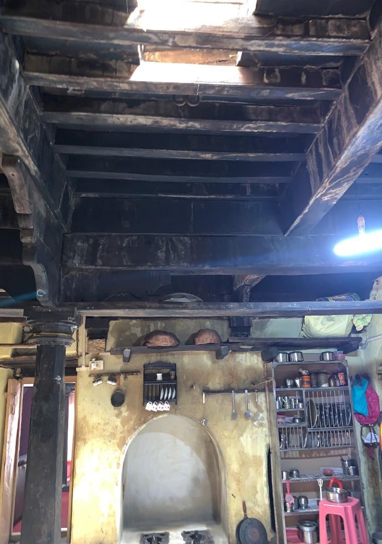 THERE IS MUD CHULHA , THIS VERY TRADITION WAY OF COOKING IN VILLAGES WHERE AS ABOUVE THOS CHULAH AT THE ROOF TOP OPENING WILL BE THERE SO THAT THE SMOKES GOES OUTSIDE FROM IT THIS MAINTANE PROPER LIGHT AND VENTILATION. THERE IS STORAGE PLACED BELOW BEAMS WHERE WE CAN SEE THOSE WOODEN UTENSILS KEPT. GRINDING
