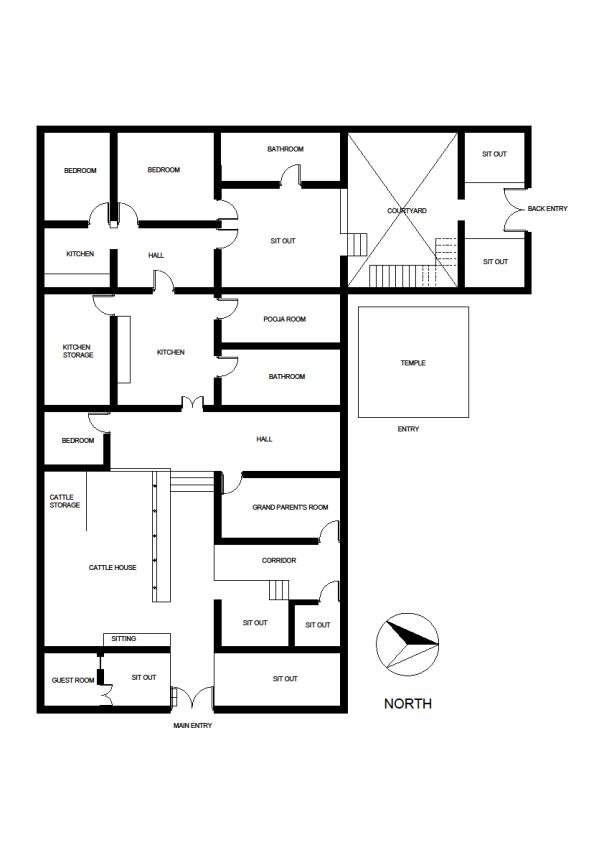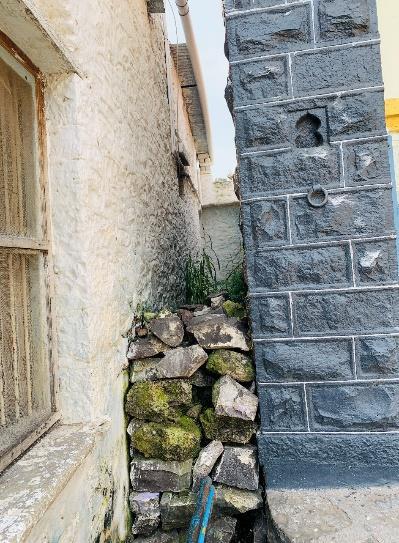 THE TEMPLE IS CONSTRUCTED SEPERATELY , NOT DIRECTLY CONSTRUCTED TO THE MAIN HOUSE BUILDING BUT IT BELONGS TO THE HOUSE AND IT HAS ITS OWN INDIVIDUAL WALLS WHERE IT ALSO SHOWS THE CONNECTIVITY THROUGH BY ADDING SOME STONES IN THE BOUNDARIES.