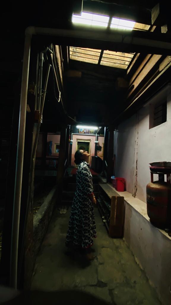 THERE IS LONG CORRIDOR WHICH ENDS CONNECTING HALL WHERE THE PLINTH OF THE HALL CHANGES AS SHOWN IN RIGHT THE CORRIDOR HAS OPENINGS ON ROOF AS SHOWN IN LEFT AND ALSO HAS DECORATIVE WOODEN PATTERNS AS SHOWN BELOW.