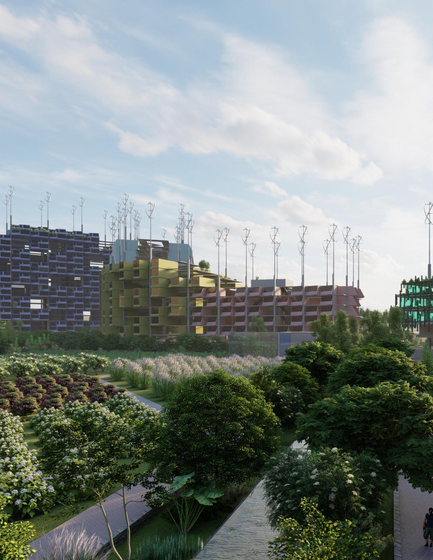 16 3bhk 1240 Sq.ft 2bhk 1000 Sq.ft 1bhk | 540 Sq.ft Studio | 320 Sq.ft 1 1 1 6 3 3 4 5 5 5 5 2 2 5 1 2 1 2 1 3 3 3 3 4 5 6 7 8 8 9 9 9 10 10 First Floor Plan 1. Vehicular Entry 2. Pedestrian Entry 3. Water-stream 4. Greenhouse 5. Pomology Farm 6. Ornamental Farm 7. Olreiculture Farm 8. Amphitheatre 9. Green seating 10. Recreational area 1. Residential Zone 2. Commercial Zone 3. Social/Cultural Zone 4. Horticulture Zone 5. Central Forest Icon 6. Green lawn