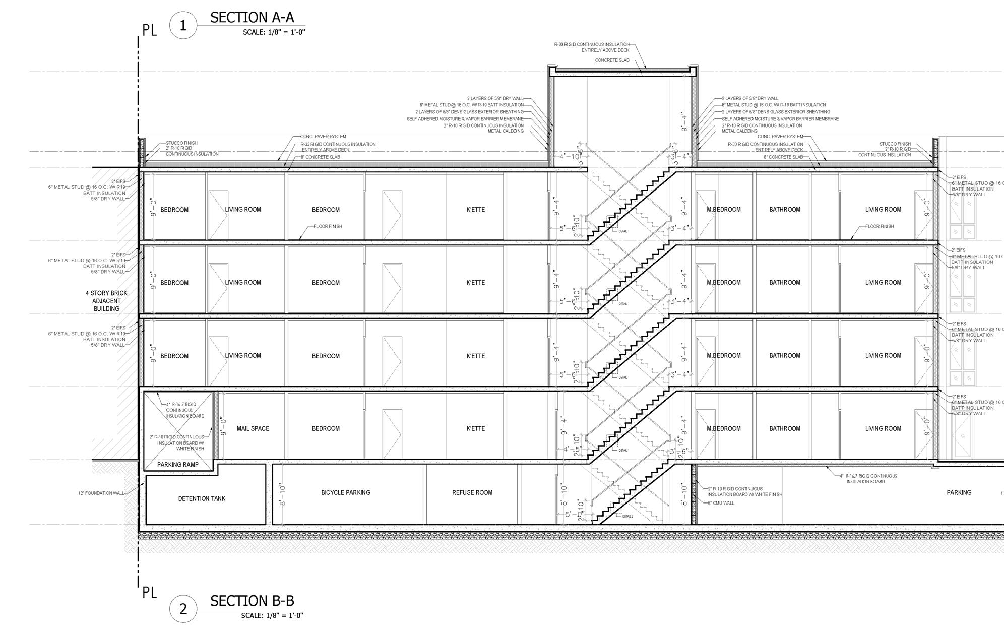 Contents 05 04 06 Professional Work Breath In Life Design Research ELEC. ROOM PARKING 8" CONCRETE SLAB R-33 RIGID CONTINUOUS INSULATION ENTIRELY ABOVE DECK 6" METAL STUD @ 16 O.C. W/ R-19 BATT INSULATION 2" R-10 RIGID CONTINUOUS INSULATION 2 LAYERS OF 5/8" DRY WALL 2 LAYERS OF 5/8" DENS GLASS EXTERIOR SHEATHING SELF-ADHERED MOISTURE & VAPOR BARRIER MEMBRANE METAL CALDDING CONC. PAVER SYSTEM PL 6" METAL STUD @ 16 O.C. W/ R19 BATT INSULATION 2" R-10 CONTINUOUS INSULATION 5/8" DRY WALL 5/8" DENS GLAS GOLD EXTERIOR SHEATHING 10 MIL.SELF-ADHERED MOISTURE & VAPOR BARRIER MEMBRANE 2" POWDER COATED METAL PANEL 6" METAL STUD @ 16 O.C. W/ R19 BATT INSULATION 2" R-10 CONTINUOUS INSULATION 5/8" DRY WALL 5/8" DENS GLAS GOLD EXTERIOR SHEATHING 10 MIL.SELF-ADHERED MOISTURE & VAPOR BARRIER MEMBRANE 2" POWDER COATED METAL PANEL 6" METAL STUD @ 16 O.C. W/ R19 BATT INSULATION 2" R-10 CONTINUOUS INSULATION 5/8" DRY WALL 5/8" DENS GLAS GOLD EXTERIOR SHEATHING 10 MIL.SELF-ADHERED MOISTURE & VAPOR BARRIER MEMBRANE 2" POWDER COATED METAL PANEL 6" METAL STUD @ 16 O.C. W/ R19 BATT INSULATION 2" R-10 CONTINUOUS INSULATION 5/8" DRY WALL 5/8" DENS GLAS GOLD EXTERIOR SHEATHING 10 MIL.SELF-ADHERED MOISTURE & VAPOR BARRIER MEMBRANE 2" POWDER COATED METAL PANEL 2" R-10 RIGID CONTINUOUS STUCCO CORRIDOR BATHROOM BATHROOM LIVING ROOM LIVING ROOM BATHROOM BATHROOM BATHROOM BATHROOM LIVING ROOM LIVING ROOM BATHROOM BATHROOM BATHROOM BATHROOM LIVING ROOM LIVING ROOM BATHROOM BATHROOM BATHROOM BATHROOM LIVING ROOM LIVING ROOM BATHROOM BATHROOM PL 4" R-16.7 RIGID CONTINUOUS INSULATION BOARD FLOOR FINISH 2" R-10 RIGID CONTINUOUS INSULATION BOARD W/ WHITE FINISH 2" R-10 CONTINUOUS INSULATION ELEVATOR PIT 12" FOUNDATION WALL 8" CONCRETE BLOCK 8" GRANITE BASE W/ 2" R-10 RIGID CONTINUOUS INSULATION 8" CMU WALL T.O. 1ST FLR +17.35' T.O. 2ND FLR +27.35' 10'-0" T.O. CELLAR +7.85' 9'-6" PROPOSED BUILDING HEIGHT 40'-0" MAX. PERMITTED BUILDING HEIGHT 45'-0" T.O. 3RD FLR +37.35' T.O. 4TH FLR +47.35' T.O. ROOF FLR +57.35' T.O. ROOF +71.35' 14'-0" OVER BULKHEAD FLR 10'-0" 10'-0" 10'-0" 31ST DRIVE BASE PLANE EL. = 17.35' GRADE BATHROOM LIVING ROOM 6" METAL STUD @ 16 O.C. W/ R-19 BATT INSULATION 2" R-10 RIGID CONTINUOUS INSULATION LAYERS OF 5/8" DRY WALL 2 LAYERS OF 5/8" DENS GLASS EXTERIOR SHEATHING SELF-ADHERED MOISTURE & VAPOR BARRIER MEMBRANE METAL CALDDING CONCRETE SLAB R-33 RIGID CONTINUOUS INSULATION ENTIRELY ABOVE DECK 2" R-10 RIGID CONTINUOUS INSULATION STUCCO FINISH 8" CONCRETE SLAB R-33 RIGID CONTINUOUS INSULATION ENTIRELY ABOVE DECK CONC. PAVER SYSTEM M.BEDROOM BATHROOM LIVING ROOM M.BEDROOM K'ETTE BEDROOM BEDROOM LIVING ROOM K'ETTE BEDROOM BEDROOM LIVING ROOM PL 2" R-10 RIGID CONTINUOUS INSULATION STUCCO FINISH 6" METAL STUD @ 16 O.C. W/ R-19 BATT INSULATION 2" R-10 RIGID CONTINUOUS INSULATION 2 LAYERS OF 5/8" DRY WALL 2 LAYERS OF 5/8" DENS GLASS EXTERIOR SHEATHING SELF-ADHERED MOISTURE & VAPOR BARRIER MEMBRANE METAL CALDDING 8" CONCRETE SLAB R-33 RIGID CONTINUOUS INSULATION ENTIRELY ABOVE DECK CONC. PAVER SYSTEM 4 STORY BRICK ADJACENT BUILDING FLOOR FINISH FLOOR FINISH 2" EIFS 6" METAL STUD @ 16 O.C. W/ R19 BATT INSULATION 5/8" DRY WALL 2" EIFS 6" METAL STUD @ 16 O.C. W/ BATT INSULATION 5/8" DRY WALL 2" EIFS 6" METAL STUD @ 16 O.C. W/ BATT INSULATION 5/8" DRY WALL 2" EIFS 6" METAL STUD @ 16 O.C. W/ 2" EIFS 6" METAL STUD @ 16 O.C. W/ R19 BATT INSULATION 5/8" DRY WALL 2" EIFS DETAIL SCALE: 1/8" = 1'-0" SECTION A-A 1 M.BEDROOM ELEC. ROOM PARKING 6" METAL STUD @ 16 O.C. W/ R-19 BATT INSULATION 2" R-10 RIGID CONTINUOUS INSULATION LAYERS OF 5/8" DRY WALL LAYERS OF 5/8" DENS GLASS EXTERIOR SHEATHING SELF-ADHERED MOISTURE & VAPOR BARRIER MEMBRANE METAL CALDDING CONCRETE SLAB R-33 RIGID CONTINUOUS INSULATION ENTIRELY ABOVE DECK 6" METAL STUD @ 16 O.C. W/ R-19 BATT INSULATION 2" R-10 RIGID CONTINUOUS INSULATION 2 LAYERS OF 5/8" DRY WALL 2 LAYERS OF 5/8" DENS GLASS EXTERIOR SHEATHING SELF-ADHERED MOISTURE & VAPOR BARRIER MEMBRANE METAL CALDDING 2" R-10 RIGID CONTINUOUS INSULATION STUCCO FINISH PL STUD @ 16 O.C. W/ R19 BATT INSULATION CONTINUOUS INSULATION 5/8" DRY WALL EXTERIOR SHEATHING MIL.SELF-ADHERED MOISTURE & BARRIER MEMBRANE COATED METAL PANEL STUD @ 16 O.C. W/ R19 BATT INSULATION CONTINUOUS INSULATION 5/8" DRY WALL EXTERIOR SHEATHING MIL.SELF-ADHERED MOISTURE & BARRIER MEMBRANE COATED METAL PANEL STUD @ 16 O.C. W/ R19 BATT INSULATION CONTINUOUS INSULATION 5/8" DRY WALL EXTERIOR SHEATHING MIL.SELF-ADHERED MOISTURE & BARRIER MEMBRANE COATED METAL PANEL STUD @ 16 O.C. W/ R19 BATT INSULATION CONTINUOUS INSULATION 5/8" DRY WALL EXTERIOR SHEATHING MIL.SELF-ADHERED MOISTURE & BARRIER MEMBRANE COATED METAL PANEL 2" R-10 RIGID CONTINUOUS INSULATION STUCCO FINISH 6" METAL STUD @ 16 O.C. W/ R19 BATT INSULATION 2" R-10 CONTINUOUS INSULATION 5/8" DRY WALL 5/8" DENS GLAS GOLD EXTERIOR SHEATHING 10 MIL.SELF-ADHERED MOISTURE & VAPOR BARRIER MEMBRANE 2" POWDER COATED METAL PANEL 6" METAL STUD @ 16 O.C. W/ R19 BATT INSULATION 2" R-10 CONTINUOUS INSULATION 5/8" DRY WALL 5/8" DENS GLAS GOLD EXTERIOR SHEATHING 10 MIL.SELF-ADHERED MOISTURE & VAPOR BARRIER MEMBRANE 2" POWDER COATED METAL PANEL 6" METAL STUD @ 16 O.C. W/ R19 BATT INSULATION 2" R-10 CONTINUOUS INSULATION 5/8" DRY WALL 5/8" DENS GLAS GOLD EXTERIOR SHEATHING 10 MIL.SELF-ADHERED MOISTURE & VAPOR BARRIER MEMBRANE 2" POWDER COATED METAL PANEL 6" METAL STUD @ 16 O.C. W/ R19 BATT INSULATION 2" R-10 CONTINUOUS INSULATION 5/8" DRY WALL 5/8" DENS GLAS GOLD EXTERIOR SHEATHING 10 MIL.SELF-ADHERED MOISTURE & VAPOR BARRIER MEMBRANE 2" POWDER COATED METAL PANEL CL BATHROOM CORRIDOR M.BEDROOM CL BATHROOM CORRIDOR M.BEDROOM CL BATHROOM CORRIDOR M.BEDROOM CL BATHROOM CORRIDOR CORRIDOR LIVING ROOM LIVING ROOM LIVING ROOM LIVING ROOM LIVING ROOM LIVING ROOM LIVING ROOM LIVING ROOM ELEVATOR PL PL PL FLOOR FINISH CONTINUOUS INSULATION ELEVATOR PIT 12" FOUNDATION WALL 8" CONCRETE BLOCK 8" GRANITE BASE W/ 2" R-10 RIGID CONTINUOUS INSULATION 8" CONCRETE BLOCK GRANITE BASE W/ 2" R-10 CONTINUOUS INSULATION 12" FOUNDA