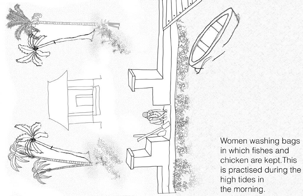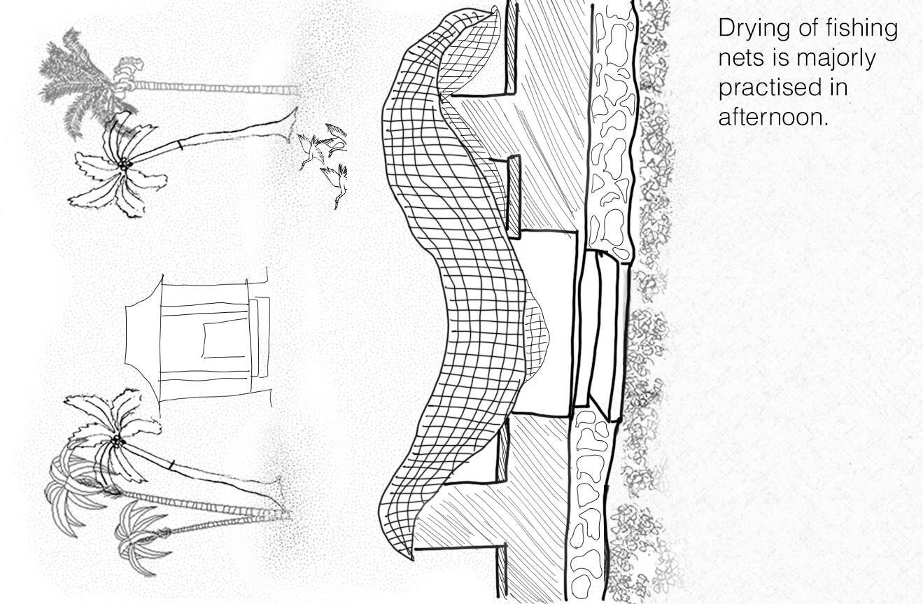 During this tour we studied different networks of these fishing communities and its typologies .The idea of the walk and the derive started from the port in Kumbhalangi,Kochi. The idea of the edge started as the hard physical edge between the land and the water. We walked back and forth moving between different places but somehoalways ended up back on the water’s edge. We started identifying the different kinds of physical edges that existed between the land and the water. The edge condition gave rise to different kinds of activities and the relationship between its immediate surroundings depending on the kind of people, their occupation and religion. Even though these edges were not physical there were distinct factors that determined the porosity, visual connect, gender and religious segregation. It was seen that Christian houses were not bounded within the four walls but spaces used on day to day basis like ‘chulas’, toilets, storage sheds, and shelters for their animals were seen softly merging with the surroundings. Comparatively the Hindu house was contained within the compound walls except for tulsi plants and gardens that happened outside thus forming a notional communal edge. Fishing, being the major occupation on the site, was carried out using different methods (Chinese fishing nets, secondary fishing, manual fishing). The fishing nets were built and owned by the locals, but a large number of migrants(Assamese, Bengalis, Biharis, Odia) worked on these nets. Manual fishing was done by migrant women, whereas large-scale fishing was done by migrant men. Eventually, we realised that the edge condition that existed was not only a physical or a visible edge but there were also notional edges that defined relationships.
