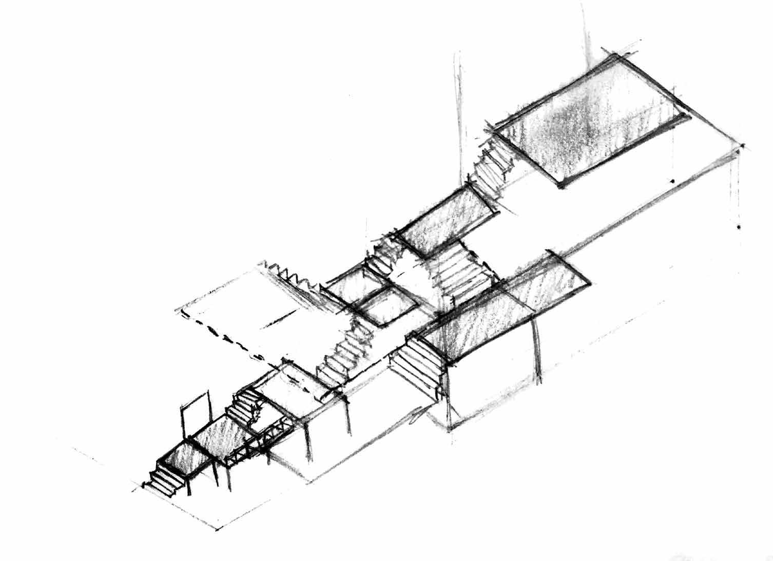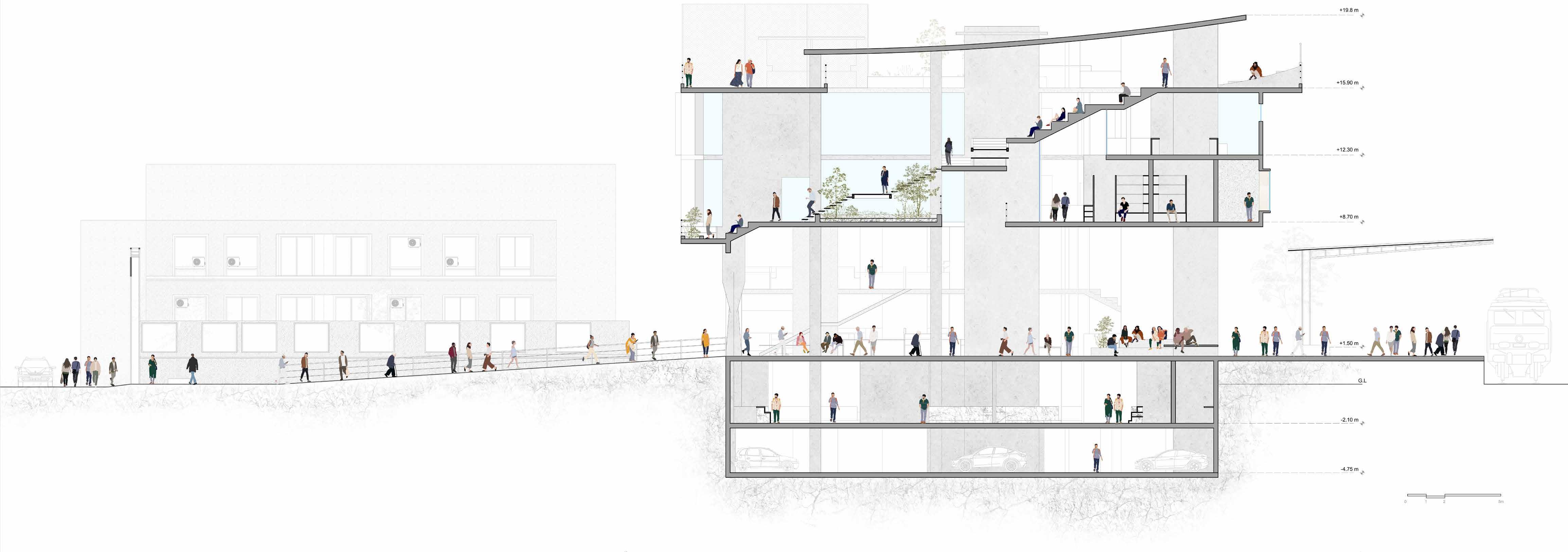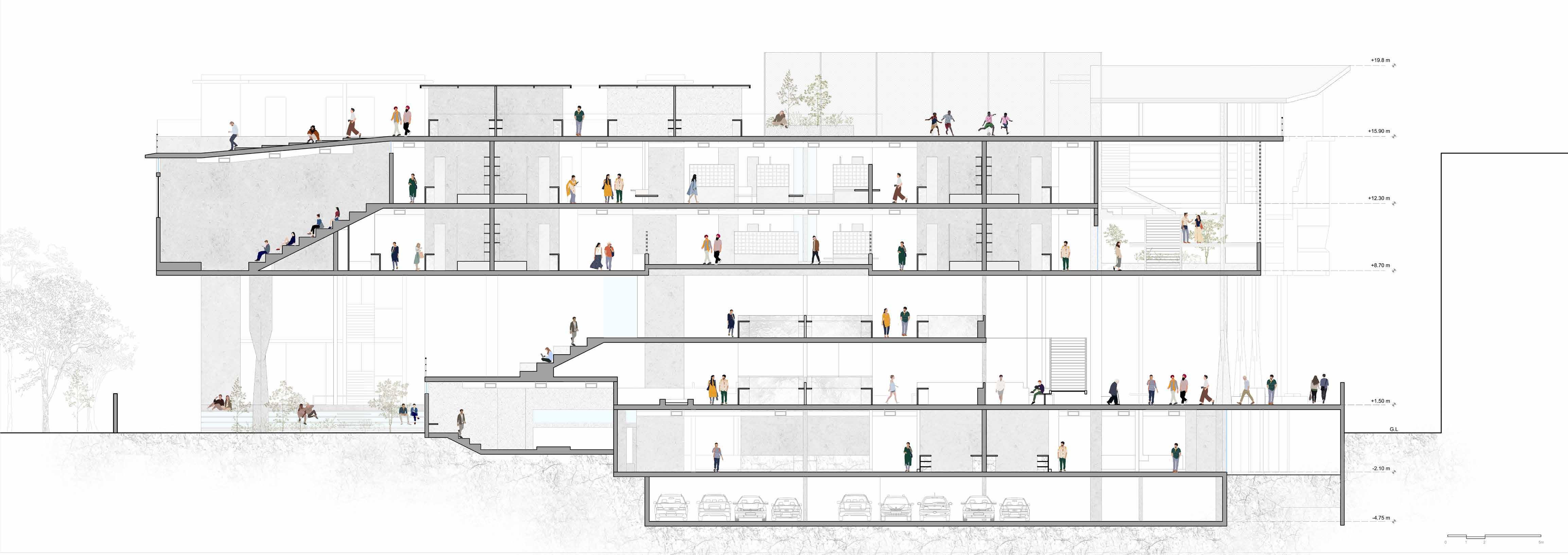 The first and second floors are occupied by clothing shops, and the rooftop transforms into a completely public space - featuring rooftop gardens, cafés, and a sports turf. The ground plane folds into a ramp that connects to the nearby station, blurring the edge between the building and public infrastructure. This gesture softens thresholds and allows for varied groupings of people, forming courts, niches, seating plinths, and amphitheatres. Part of the ground floor folds and becomes the basement and mezannine through steps as a seating form, which extends to become a public amphitheatre.
