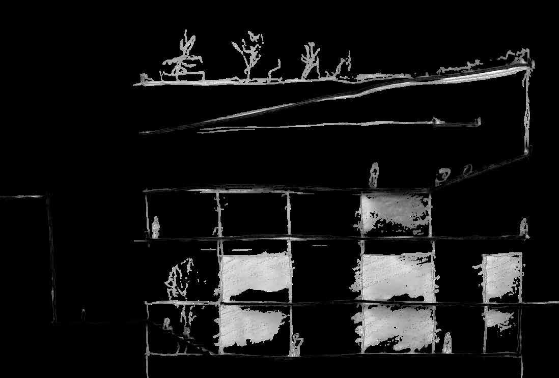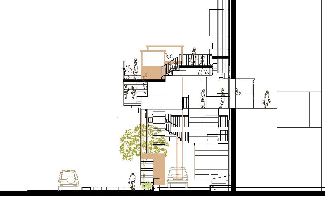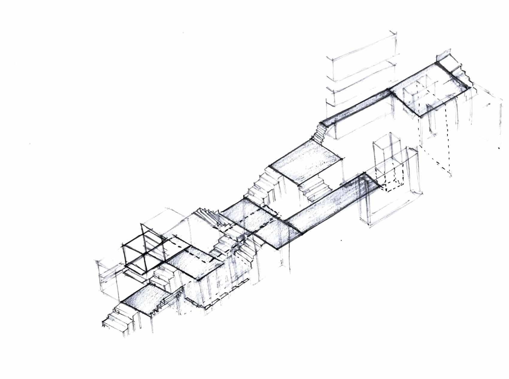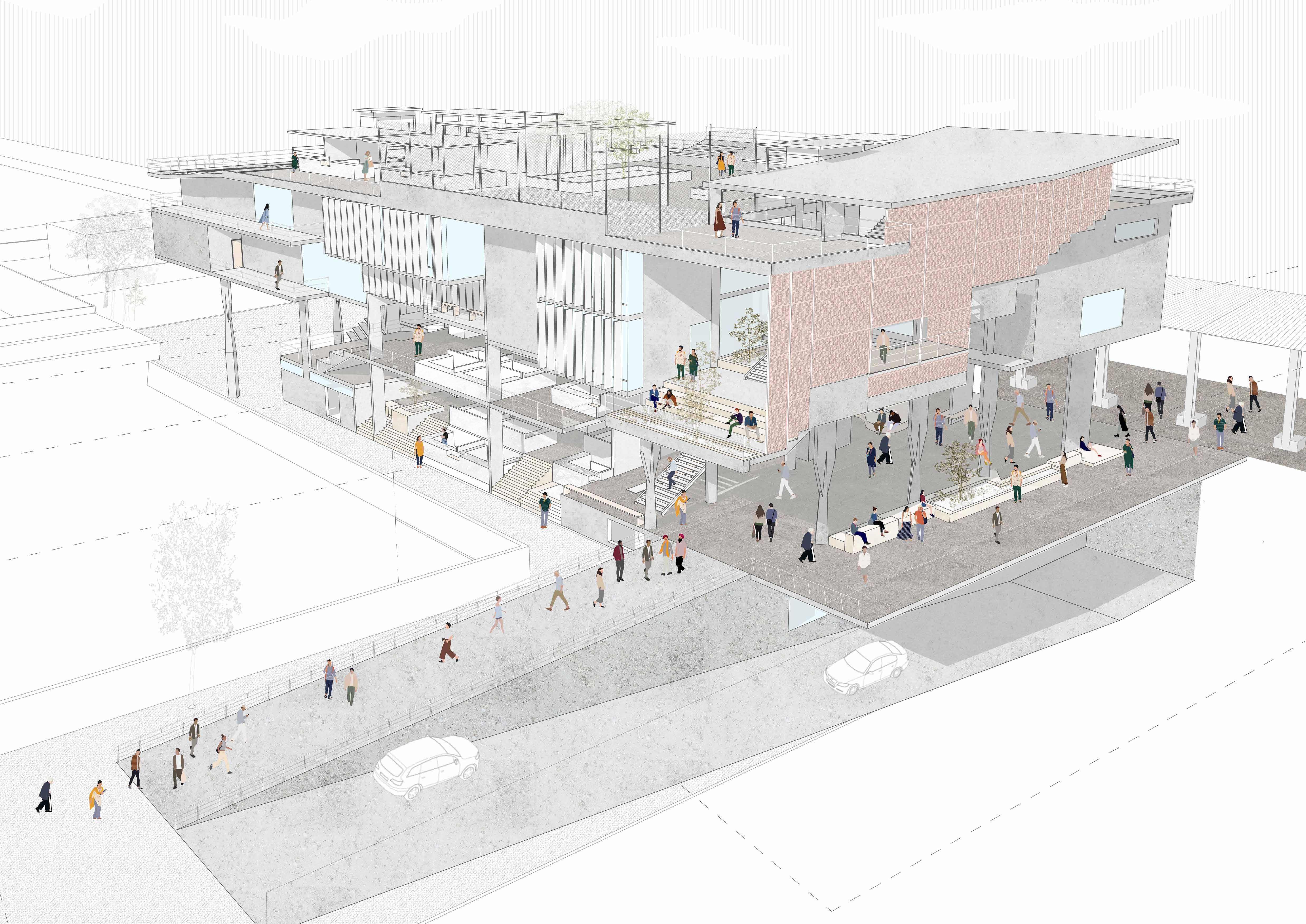 The first and second floors are occupied by clothing shops, and the rooftop transforms into a completely public space - featuring rooftop gardens, cafés, and a sports turf. The ground plane folds into a ramp that connects to the nearby station, blurring the edge between the building and public infrastructure. This gesture softens thresholds and allows for varied groupings of people, forming courts, niches, seating plinths, and amphitheatres. Part of the ground floor folds and becomes the basement and mezannine through steps as a seating form, which extends to become a public amphitheatre.