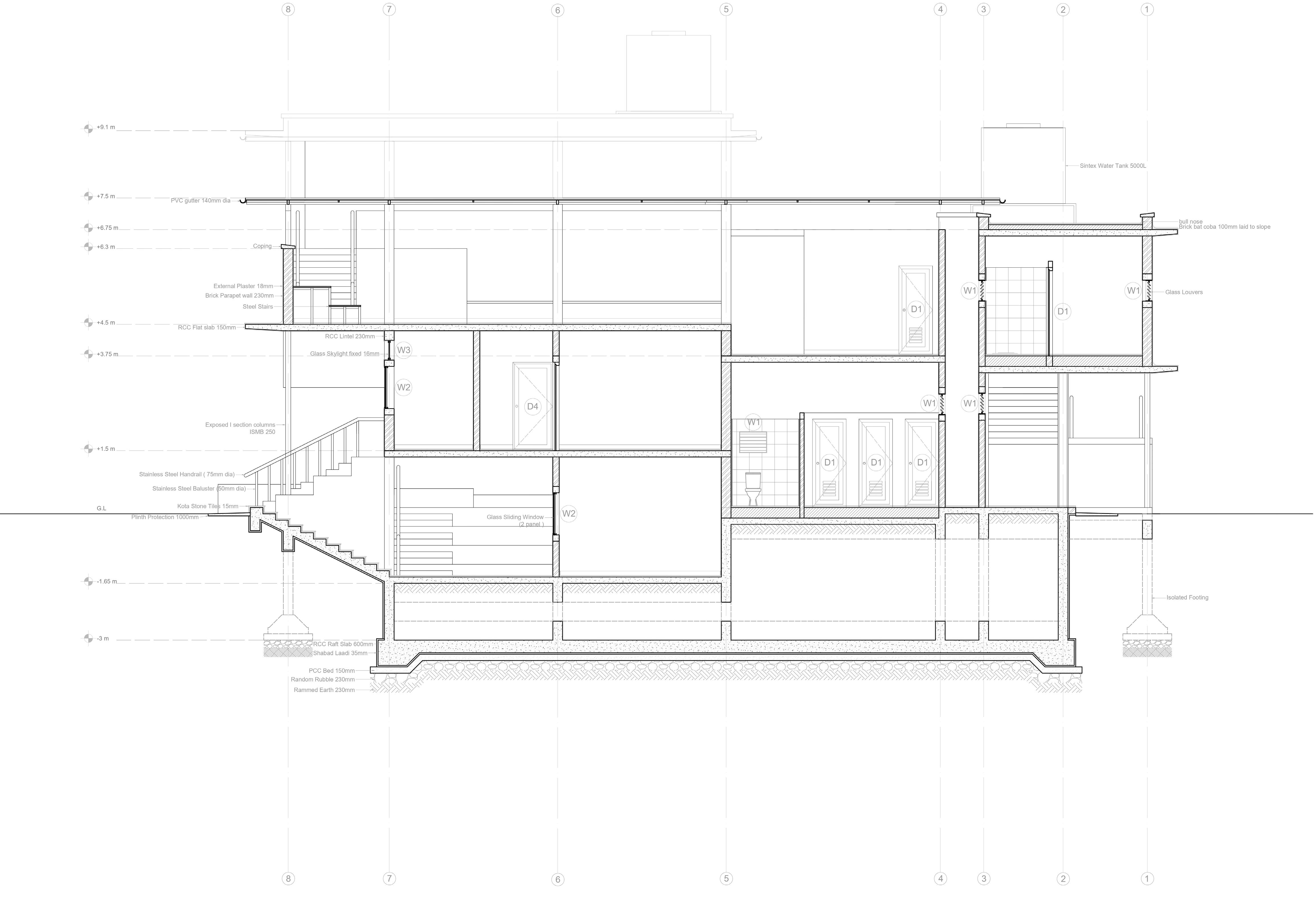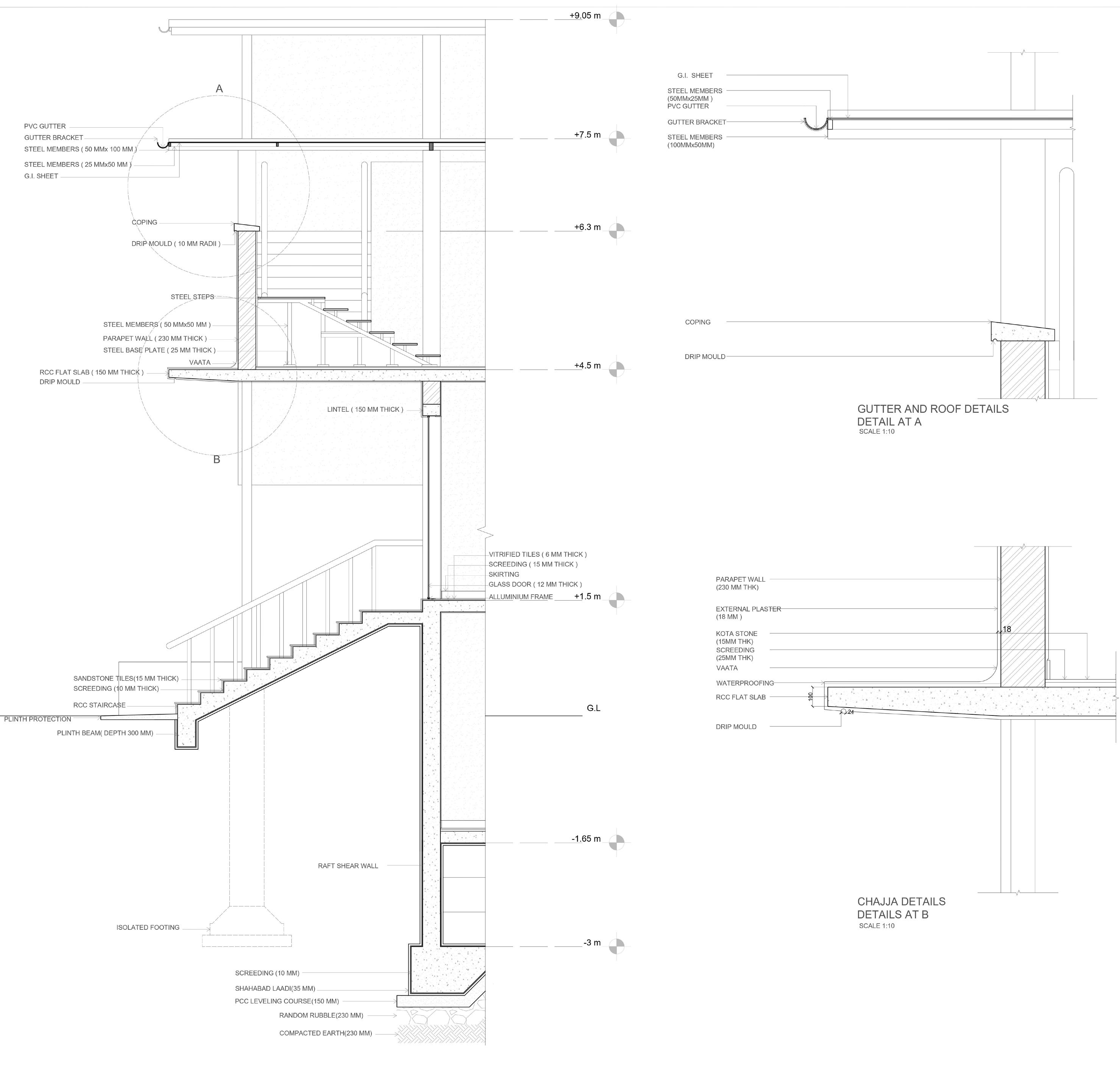 The basement is constructed at 1.5m from ground lvl supported by a raft foundation which goes upto 3m deep.Varying levels are constructed by flat slabs.