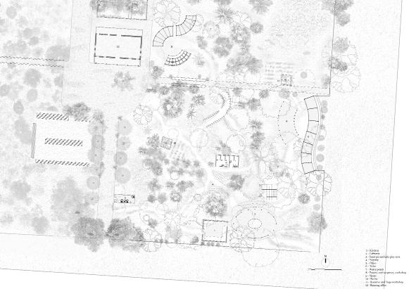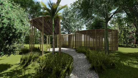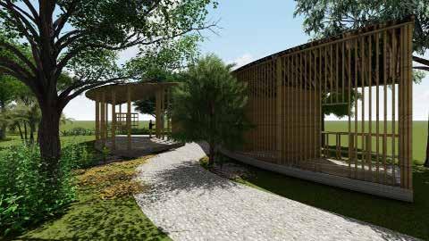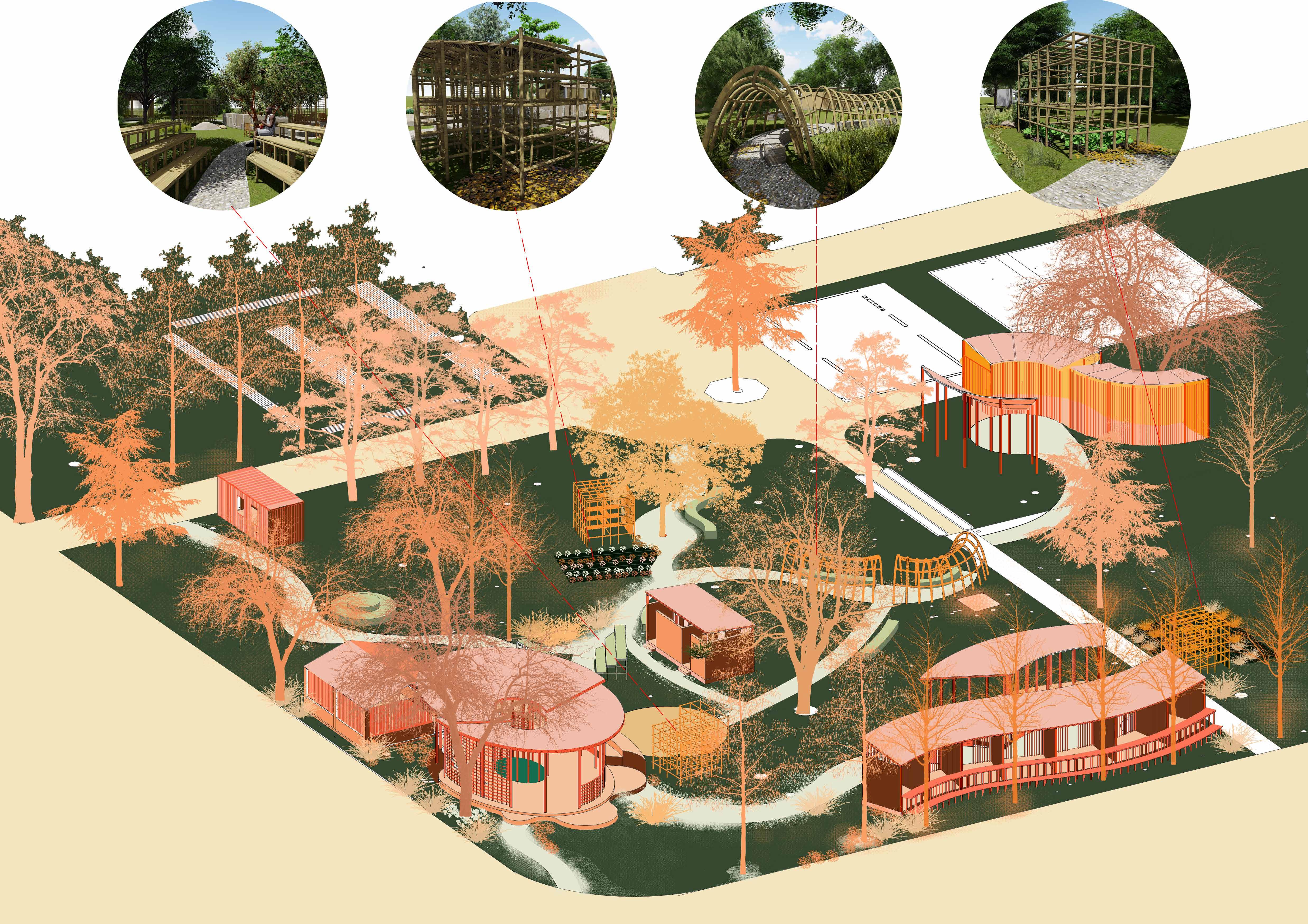 Natural site conditions crafted the network of pathwalks where intermediate pavilions, amphitheatre spaces and nursery for plants are designed. Kids play area is designed by creating a jungle gym from bamboo and having a sand pit. Various ponds are created for treatment and storage of water. Farming spaces are made along the walkways so that while walking one also experinces it. Various workshops for farming can also be conducted and will be used inside the cafetaria itself.