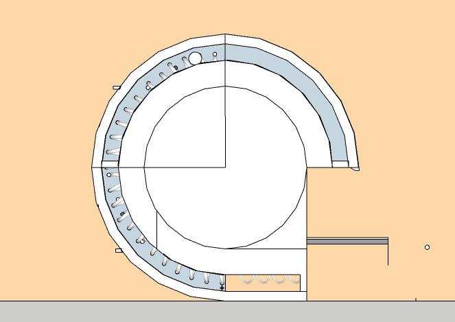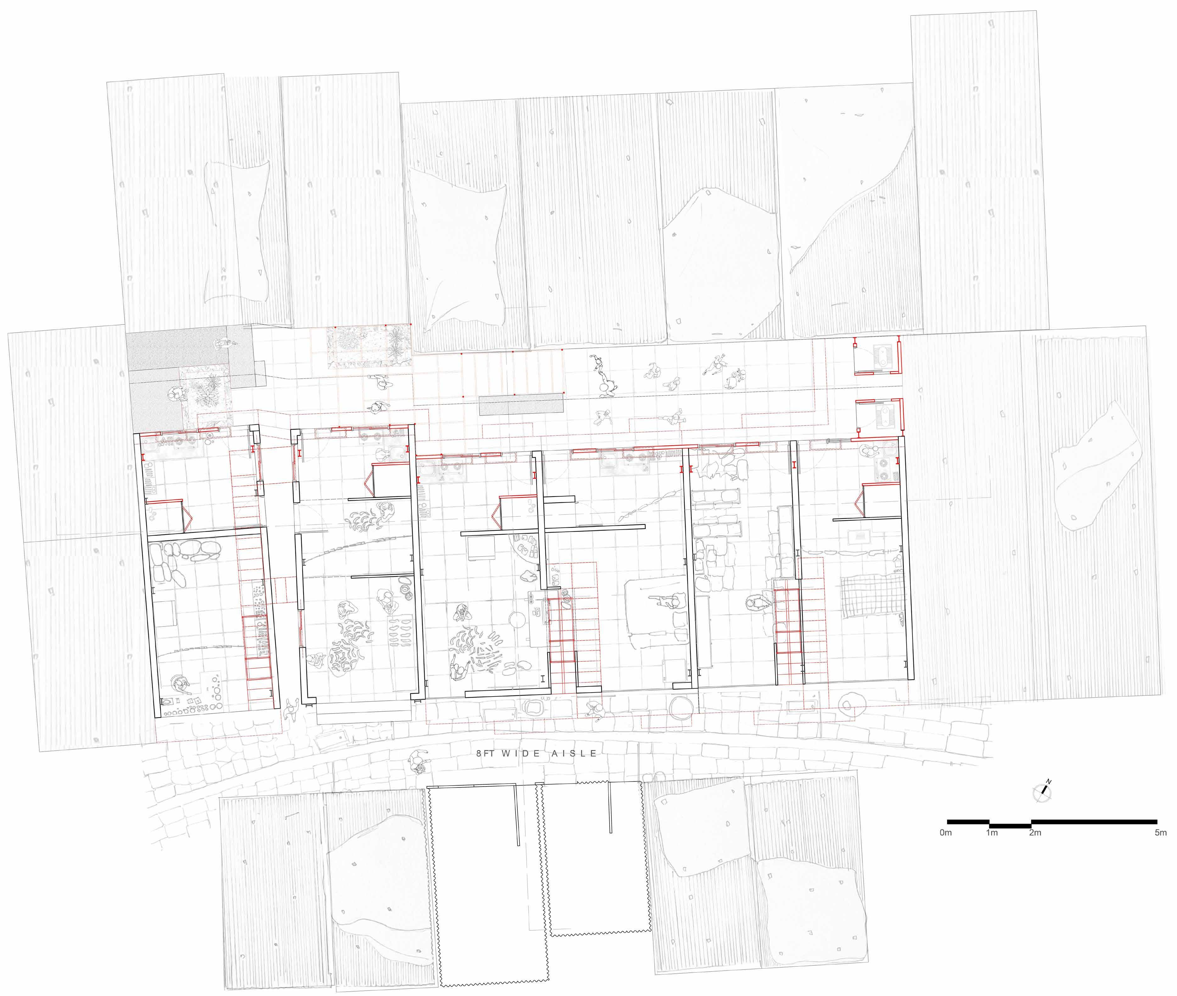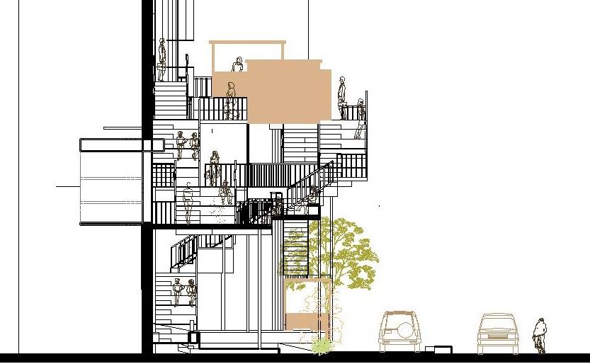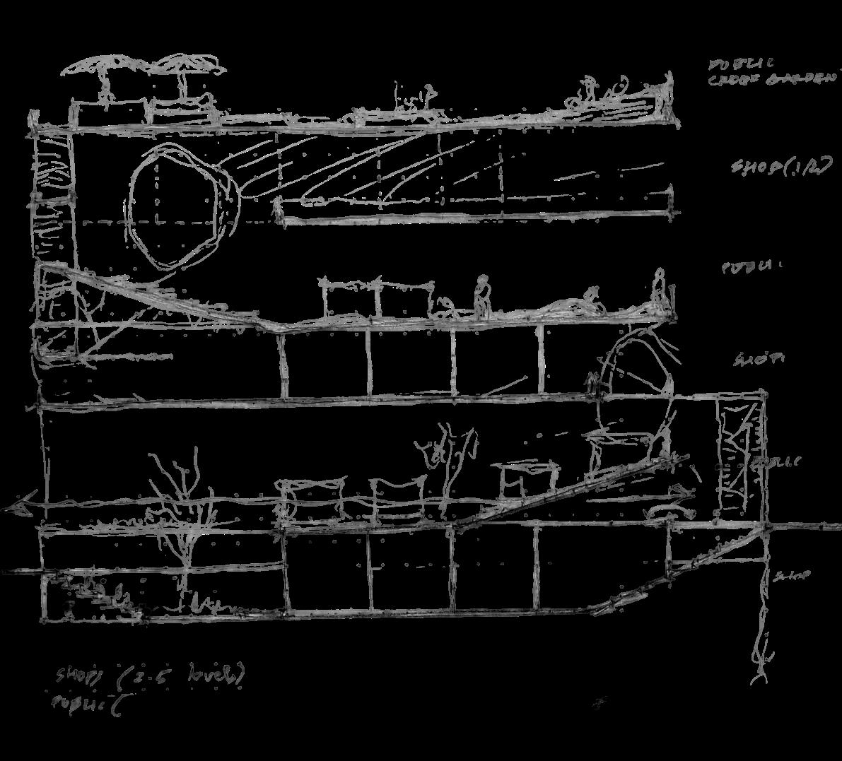 Section through the shops showing how they are carved out from the inside of the mall and merges the inside and outside Autocad