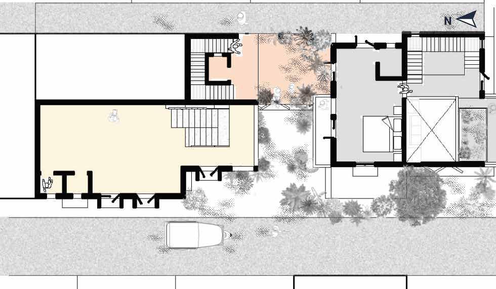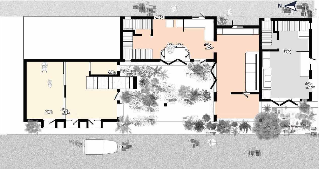 Ground floor plan opening up to backyard created from scooping out of houses Autocad + Photoshop