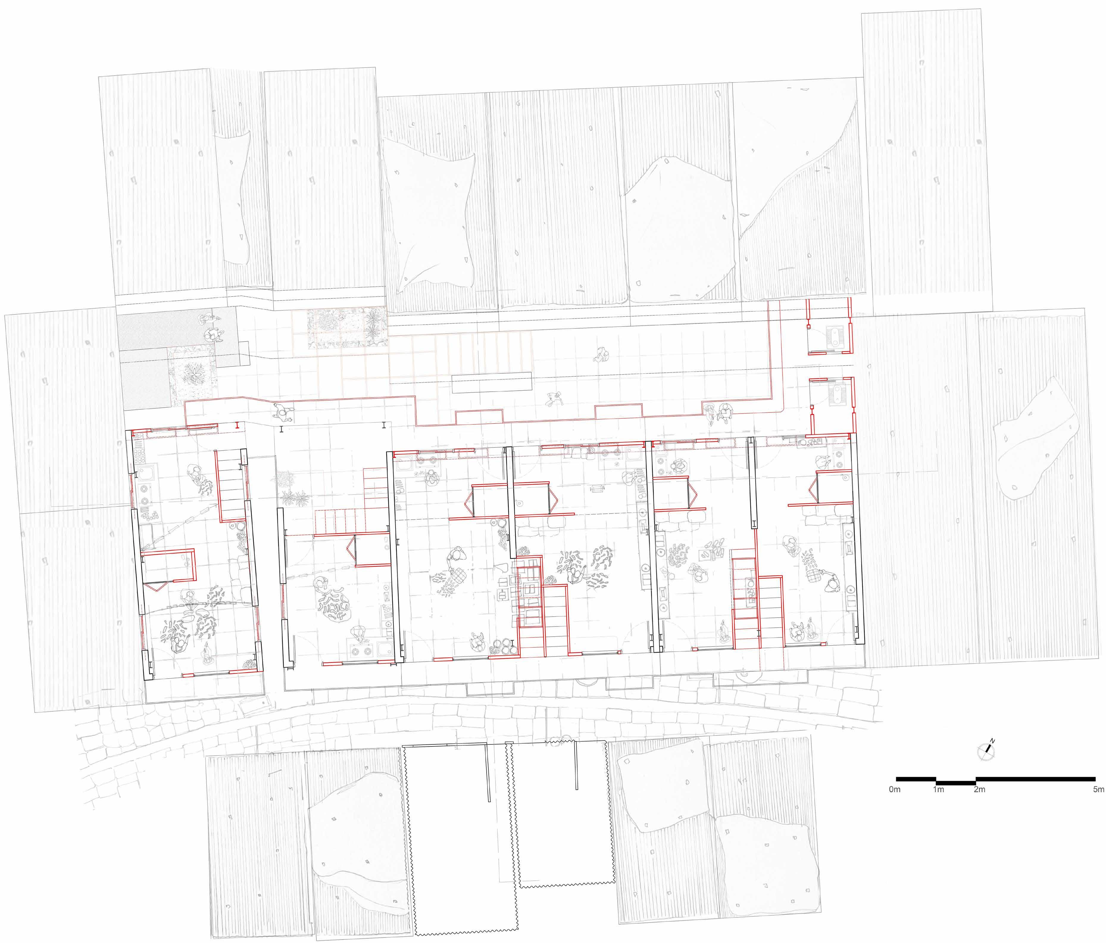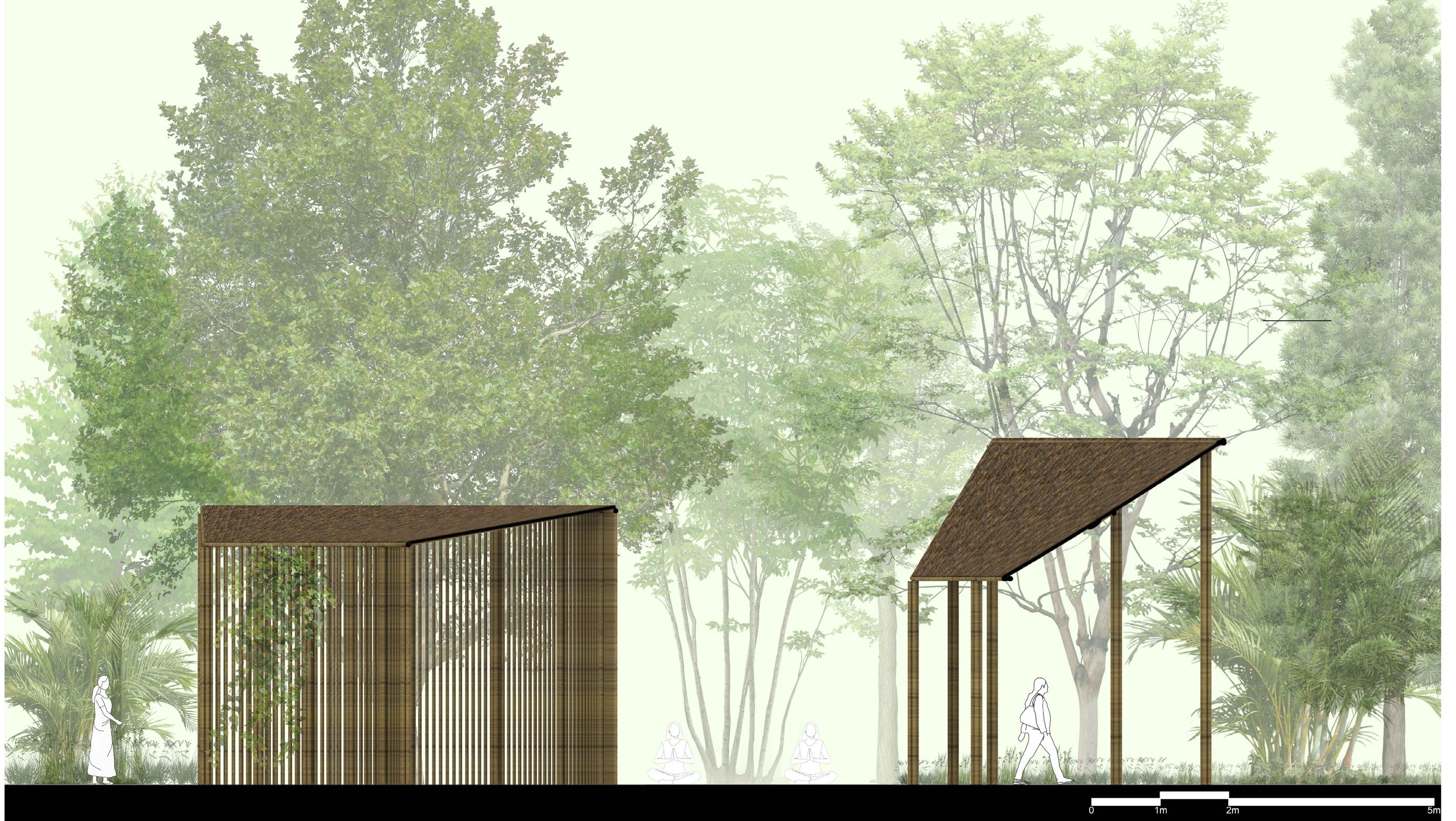 The site Aarey Vasundhara in Aarey Milky Colony was a real life site project where the requirements were to build a cafetaria , workshop spaces and shops along with landscaping and creating nature trails. The exploration started by understanding the existing trees types , its location and how spaces can be imagined around it. Materiality was really important as the project was to be a temporal structure which respects the nature and hence bamboo and stones were used. The form for the cafetaria was taken such that the plinths were shaped by the trees , creating these levels of intimacies by open , semi-open and closed spaces. The form of shops which opens up to a pottery workshop behind , will add to the selling of the artworks through them.Having sloped roof will allow for collecting rain water and can be treated and reused in the site. Cafetaria has a central courtyard and amphitheatre space as well for local art practises like dancing and raps to happen.