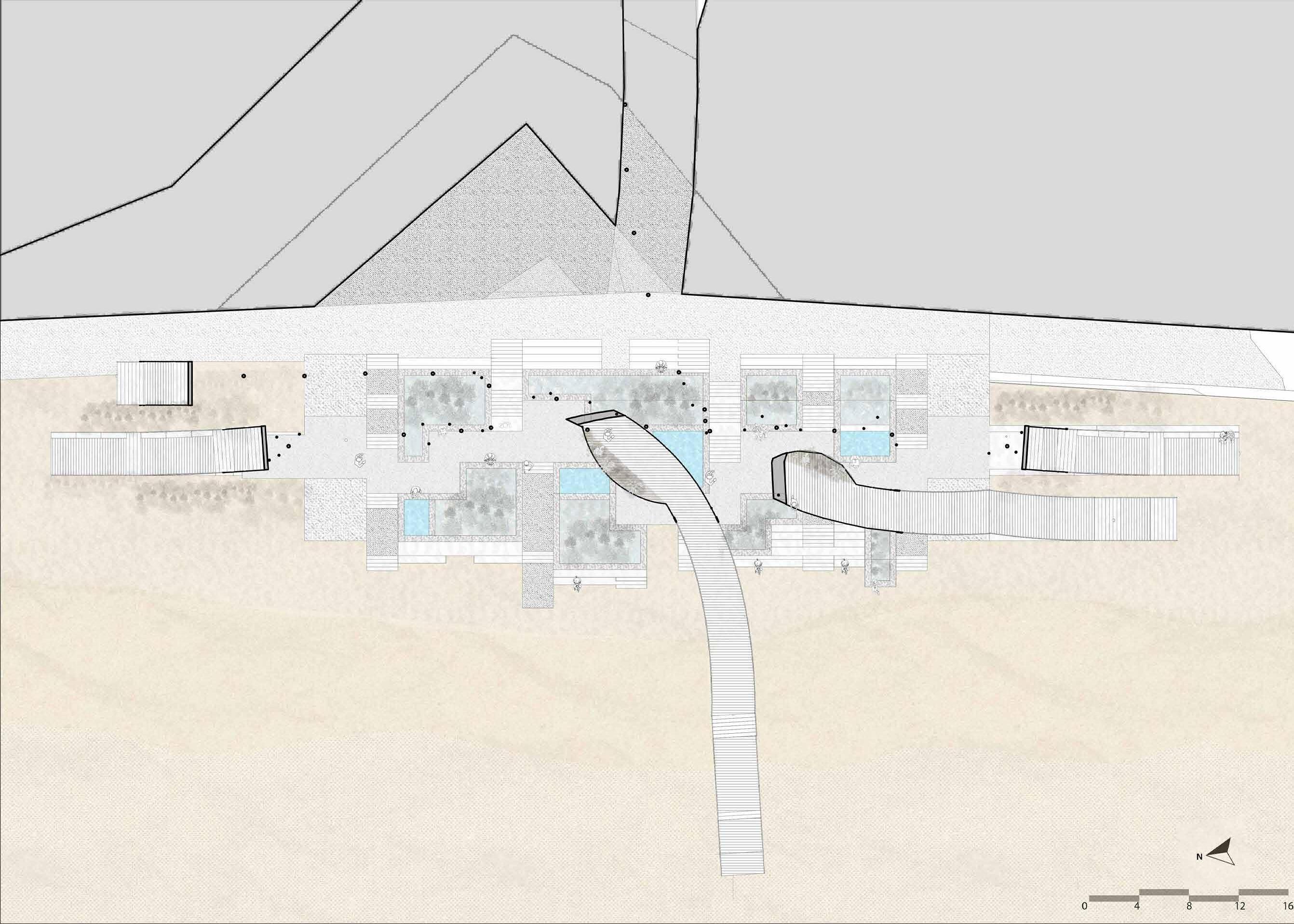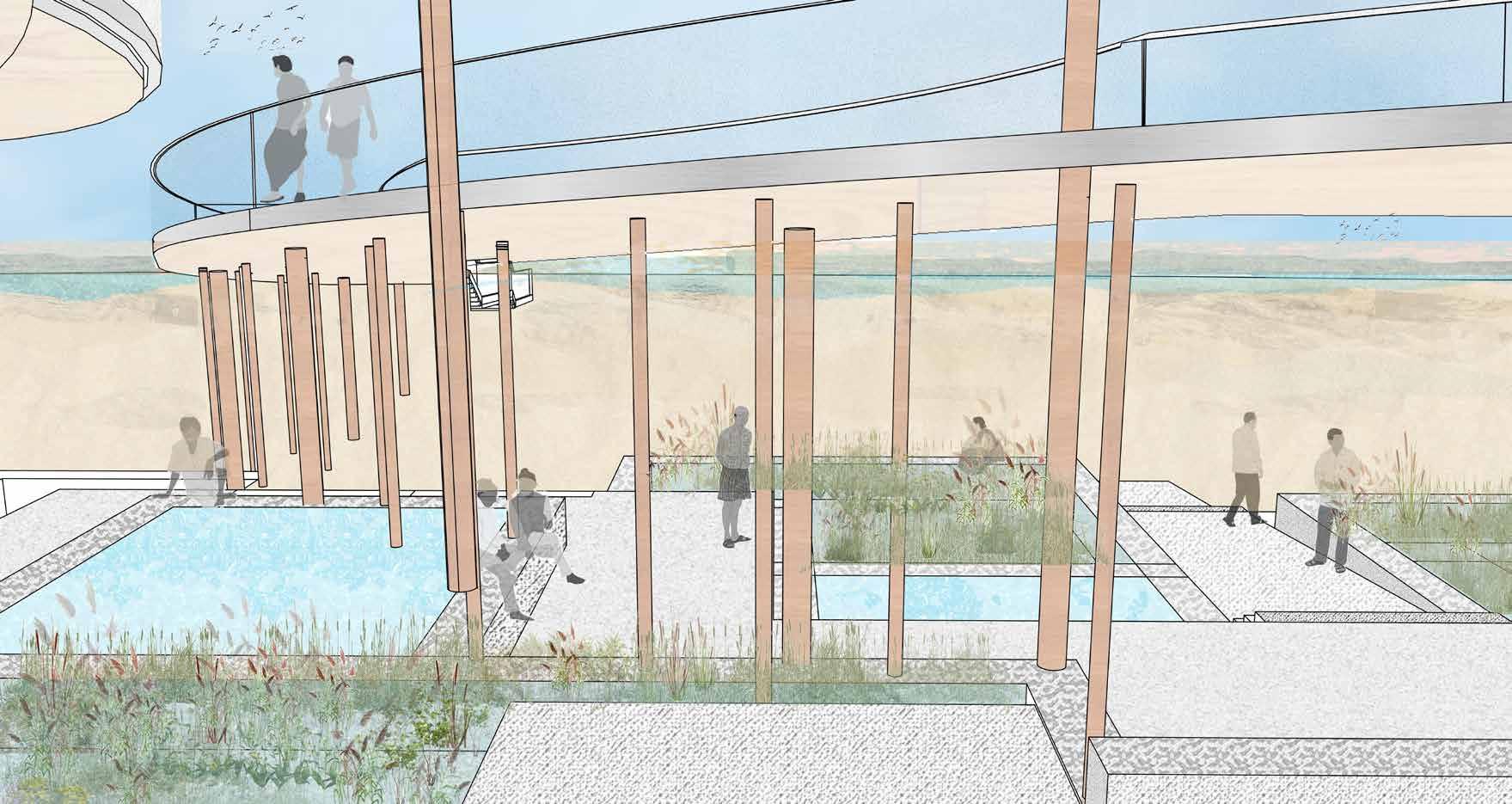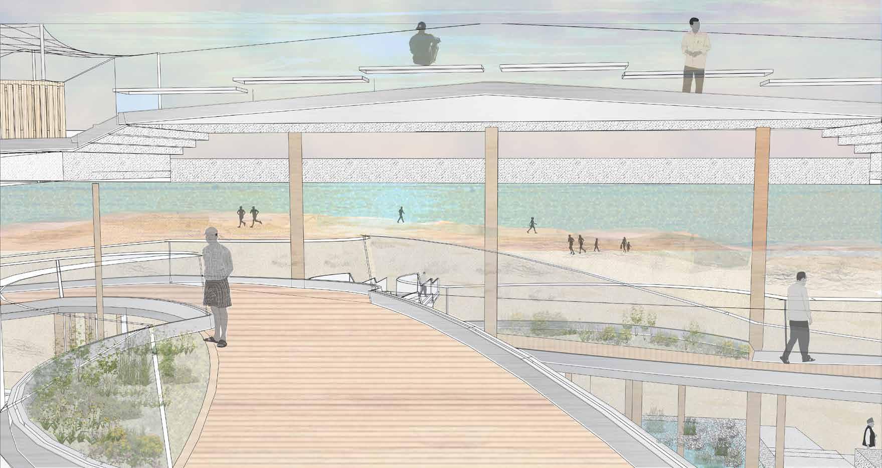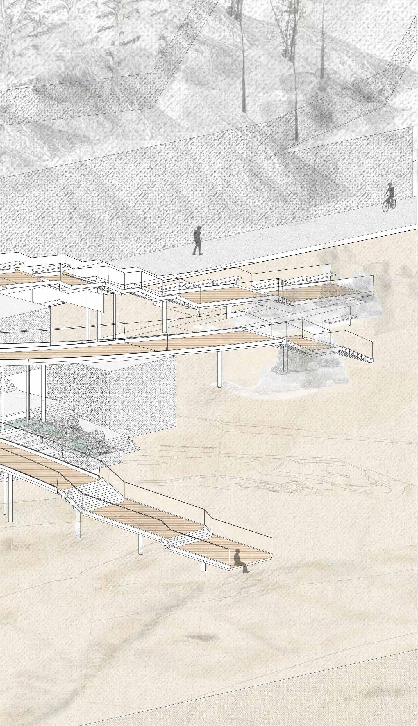 Having amphitheatre with reed bed spaces below which allows one to interact with the vegetation of reed beds and making the services part of the design. Along with it having admin spaces , washroom , bathroom and locker spaces along with a pumping/maintenance room to control the flow of water in the reed bed systems. Creating pausing spaces on the walkways along with sitting spaces. The walkways connect the surrounding in a way which makes the structure accessible for people walking along the jogging tracks and even for people living in settlements. Creating different levels in between walkways which will create different volumes of spaces in between and creating nuances like deck for a walkway becomes sitting spaces for another walkway. One of the walkways leading into the ocean where once can sit on the deck itself and experiencing the ocean.