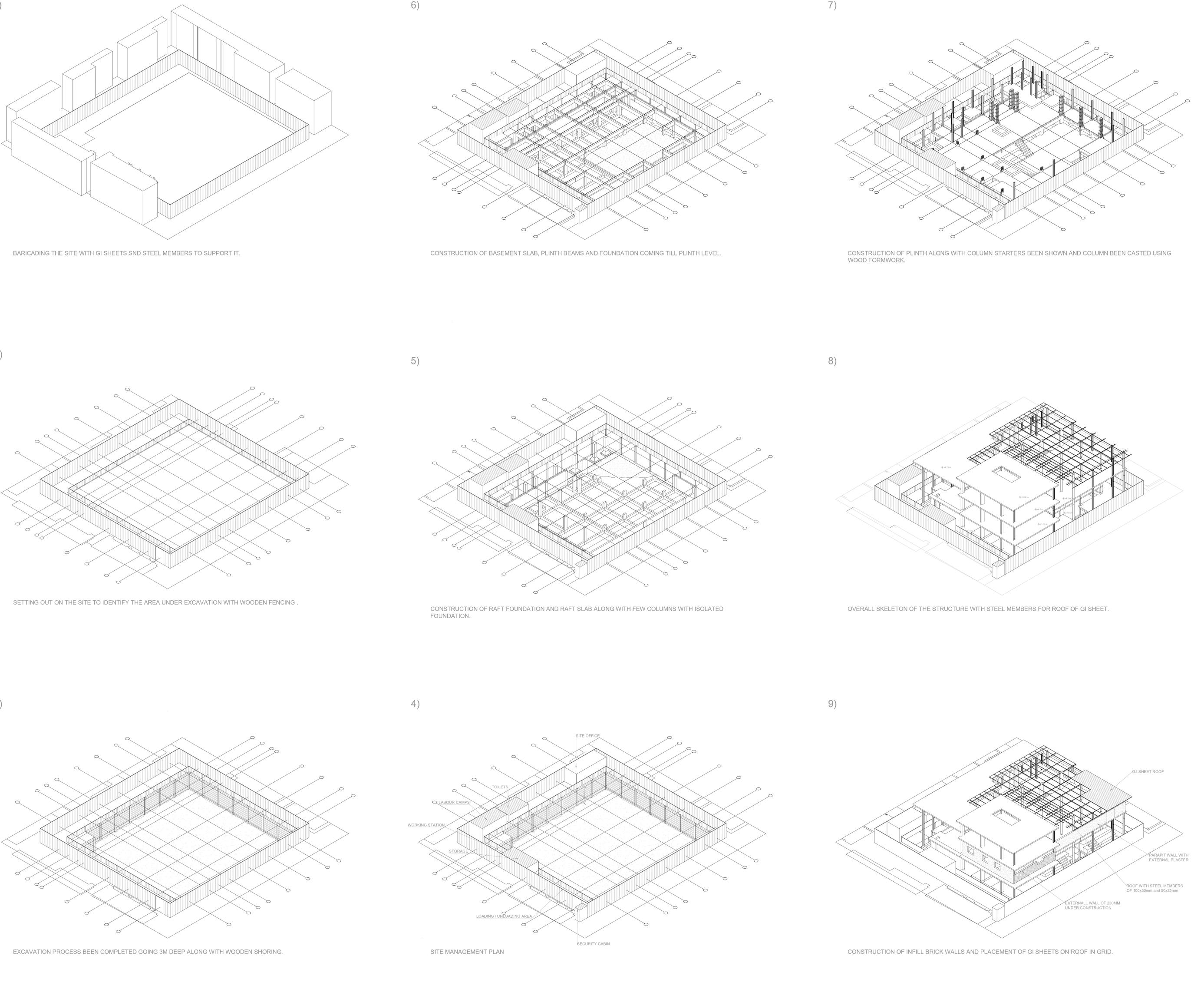The construction will be done in such a way the once the excavation pit and shoring are done the raft foundation will be laid followed by construction of basement and plinth beams and then slabs for different levels.The civil work of the structure will be finished my making of infill walls and placement of GI sheets.