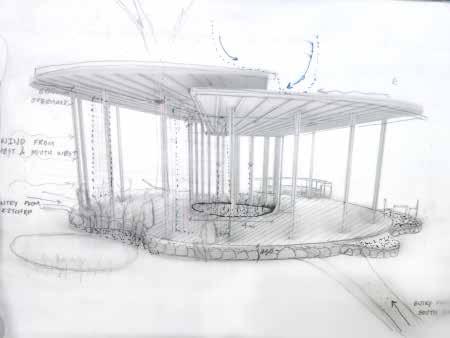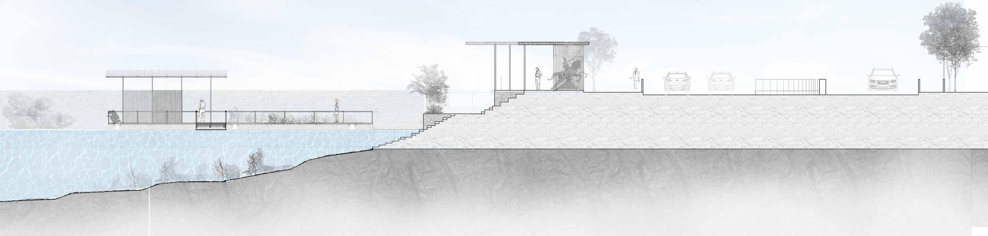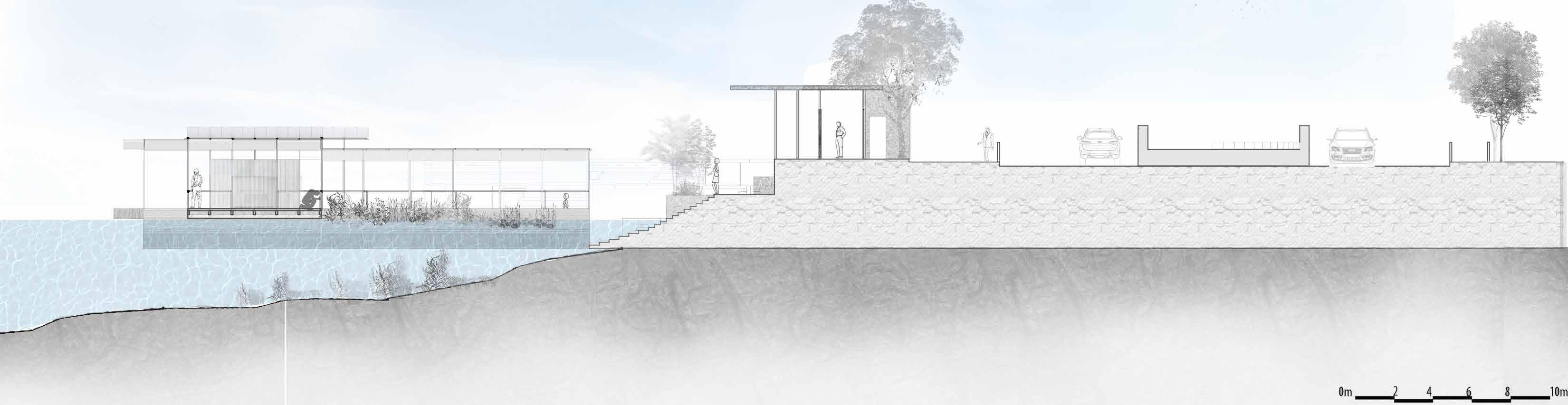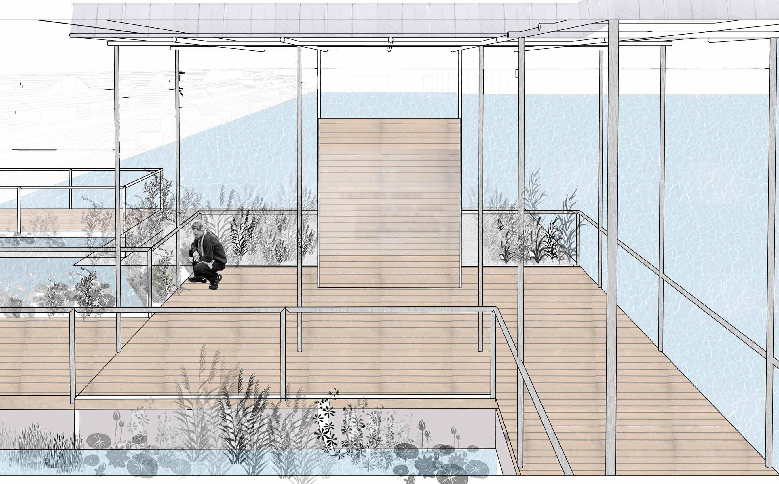 The experience of being inside a boat pavilion which looks over to more static form of biodiversity of lake on one side and more dynamic form of lake on other. The experience of walking with water .
