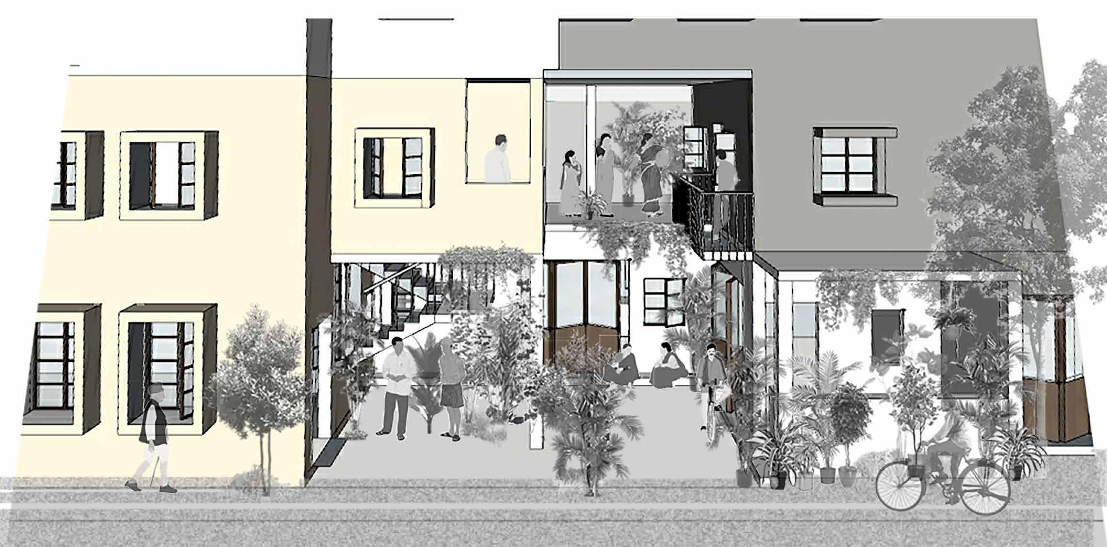 Different kind of interaction of greens with the overlapping houses like the doors opening up to greens and vegetation enabling a different kind of cooking space like they used to do in their backyards.