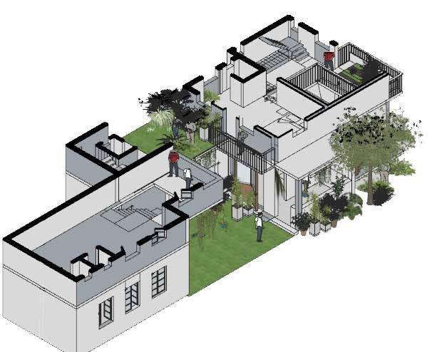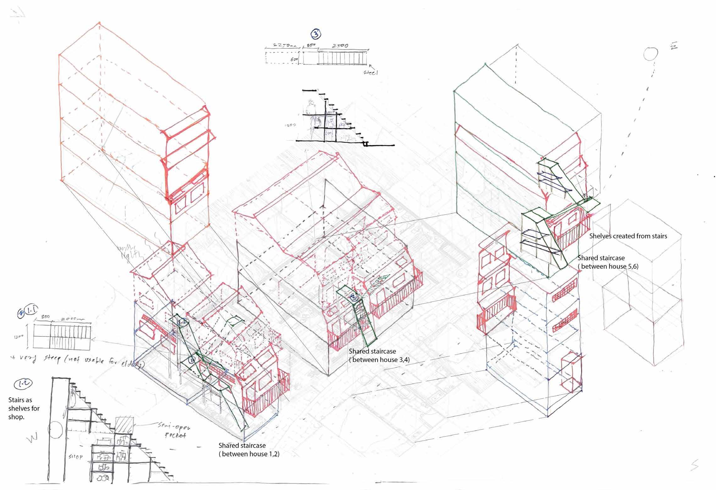 Ground floor becomes an extension of the frontyard spaces and becomes a public space between 3 houses, on first floor pocket gardens are created with overlooking balconies on vegetations. Sketchup + Autocad + Photoshop + Illustrator