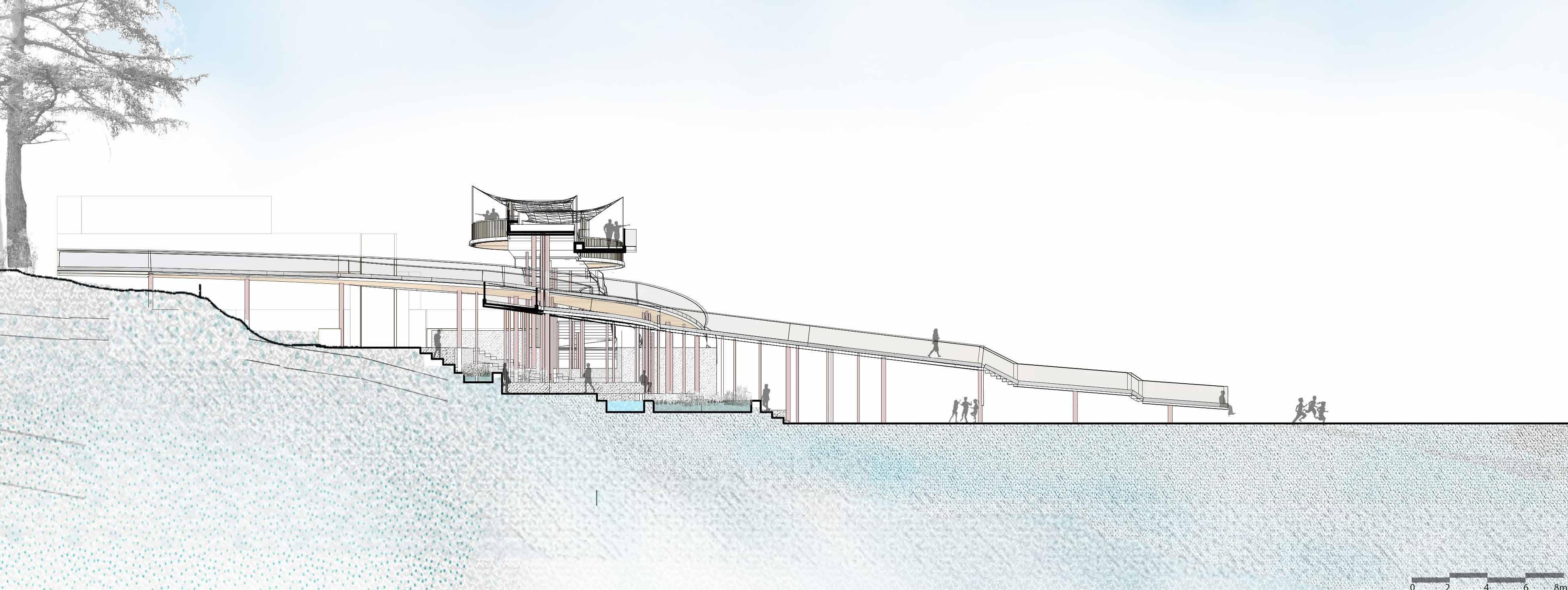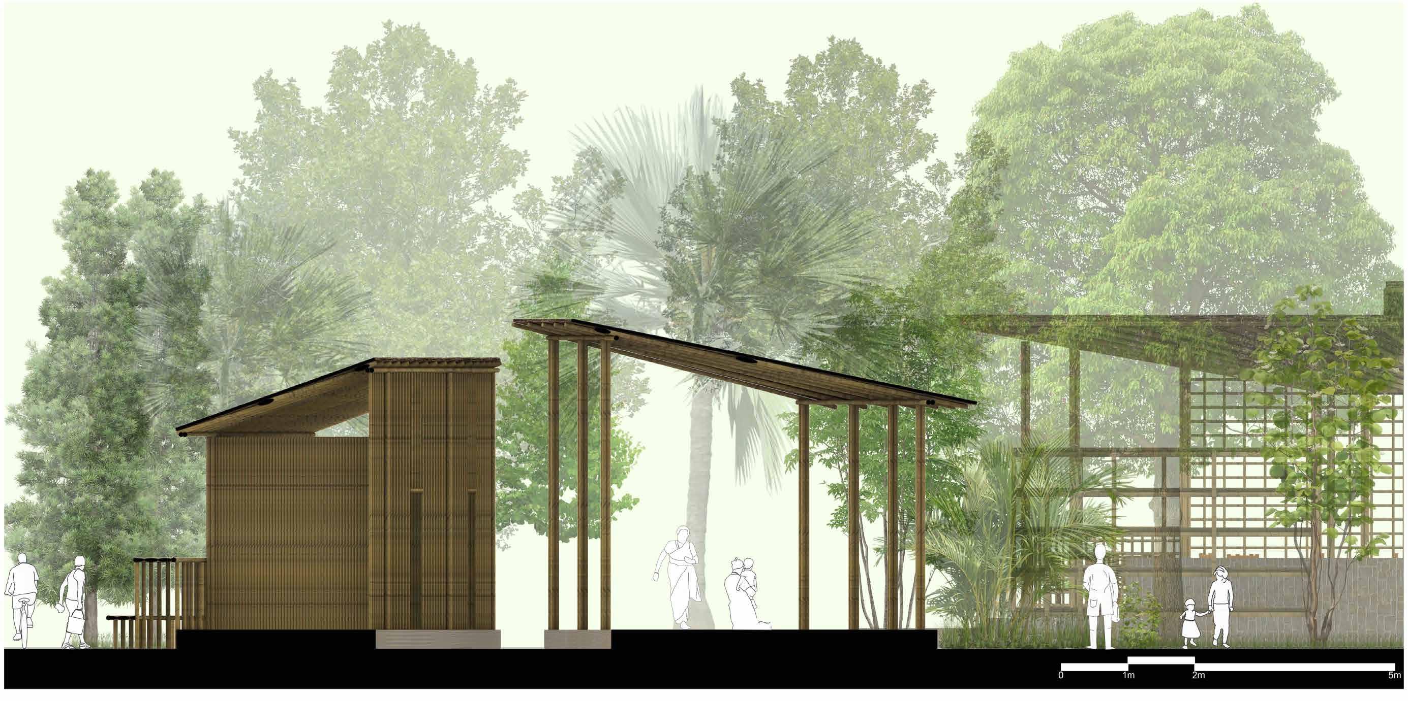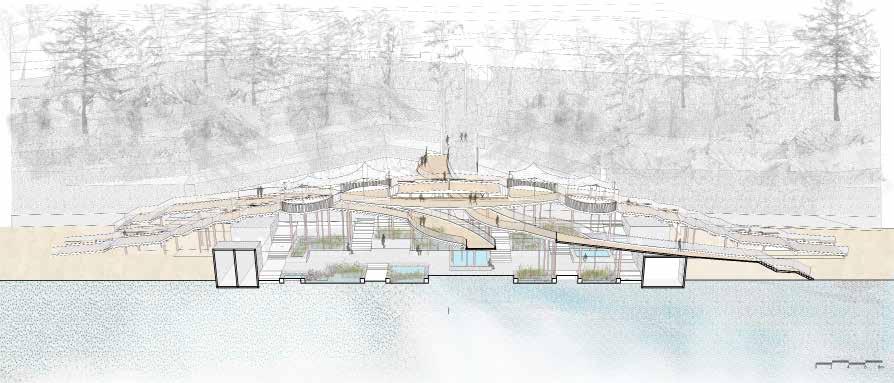 Section through shops and workshops showing structure and coming together of space with nature. Rhino + Sketchup + Autocad + Photoshop