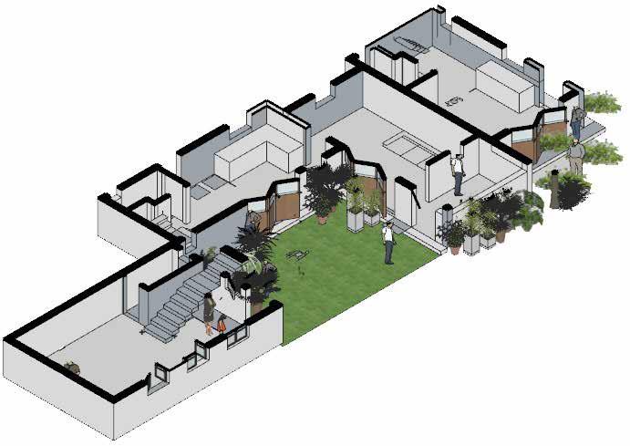 Porosity is created in the structure from where the greens and vegetation flow . Creating different kind of nuances like when one passes through stairs will also pass through greens and tend to pause. Creating gathering spaces for the families living inside the house beside the greens.