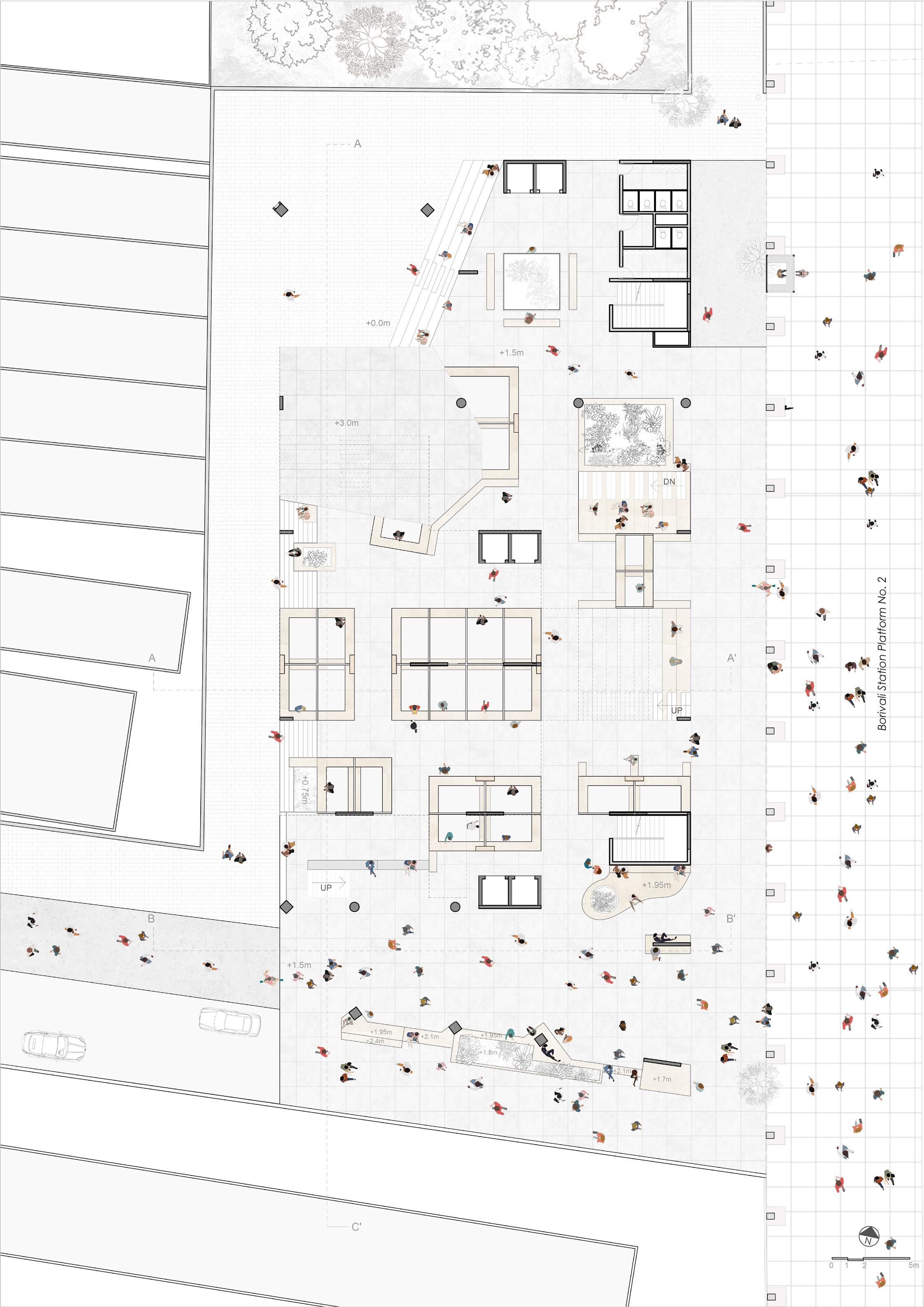 The project rethinks the form of the existing Indraprastha Shopping Center in Borivali West through the logics of groupings and claims. The site is located between two heavily used public datums with Borivali railway station platform number 2 on its east and S.V. road on west.