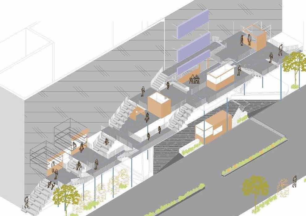 Different sections cut at different axis show how plinth levels are coming together with stairs and some of the plinth levels are just enough for one to sit on one level and stand on another. Different levels shows how things are coming together and how plug ins are situated, steel slabs come together with the edge of the mall. Like the experince of plinth of one shop turns into shelf for another or how shelf of one shop turns into roof for another. The idea of facade which was just used for advertising can now become a more user friendly space where people can go behind banners , part of facade now opening inside the mall to get a sneak peek ,railings opening up to become seating spaces.