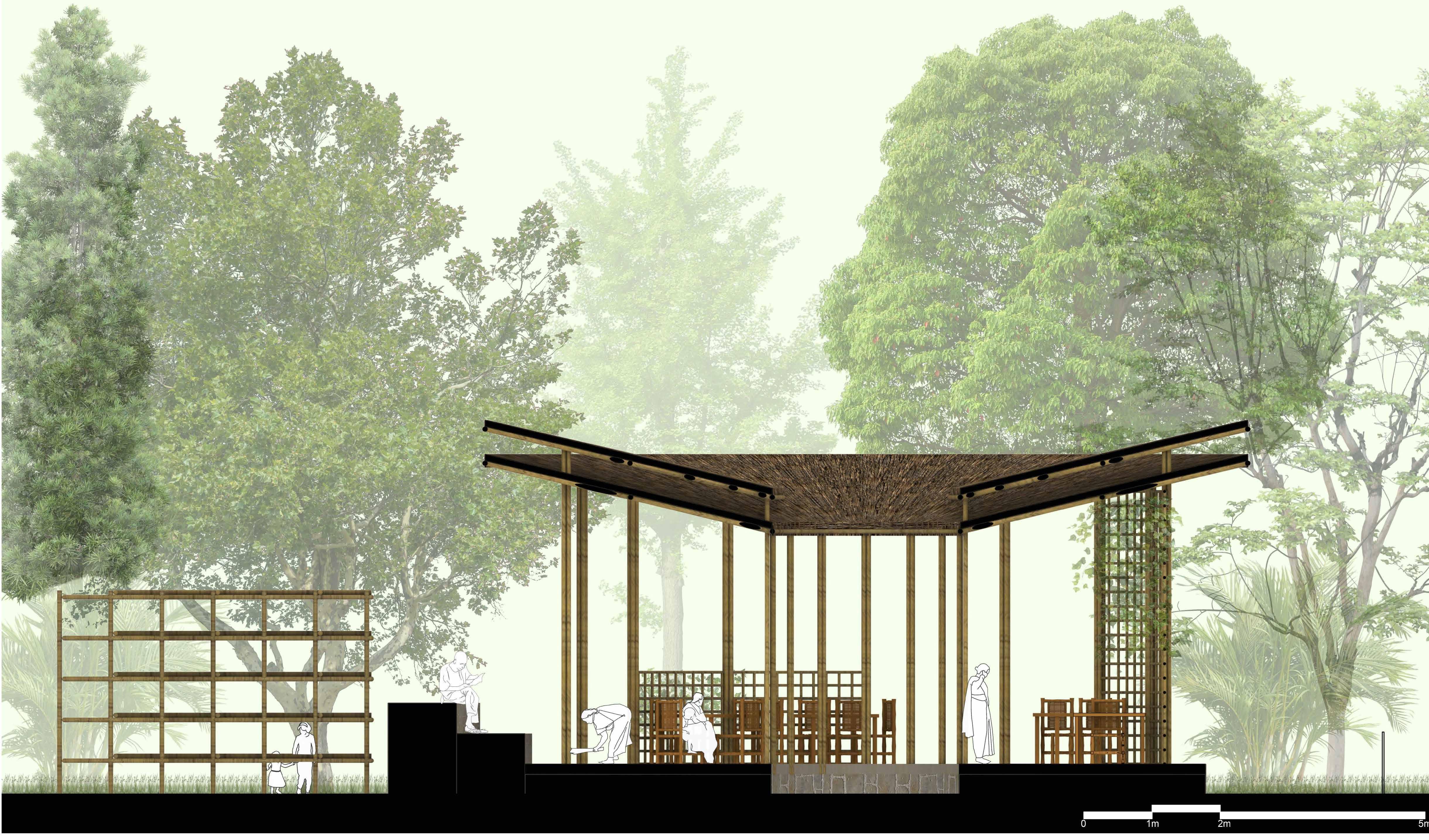 The site Aarey Vasundhara in Aarey Milky Colony was a real life site project where the requirements were to build a cafetaria , workshop spaces and shops along with landscaping and creating nature trails. The exploration started by understanding the existing trees types , its location and how spaces can be imagined around it. Materiality was really important as the project was to be a temporal structure which respects the nature and hence bamboo and stones were used. The form for the cafetaria was taken such that the plinths were shaped by the trees , creating these levels of intimacies by open , semi-open and closed spaces. The form of shops which opens up to a pottery workshop behind , will add to the selling of the artworks through them.Having sloped roof will allow for collecting rain water and can be treated and reused in the site. Cafetaria has a central courtyard and amphitheatre space as well for local art practises like dancing and raps to happen.