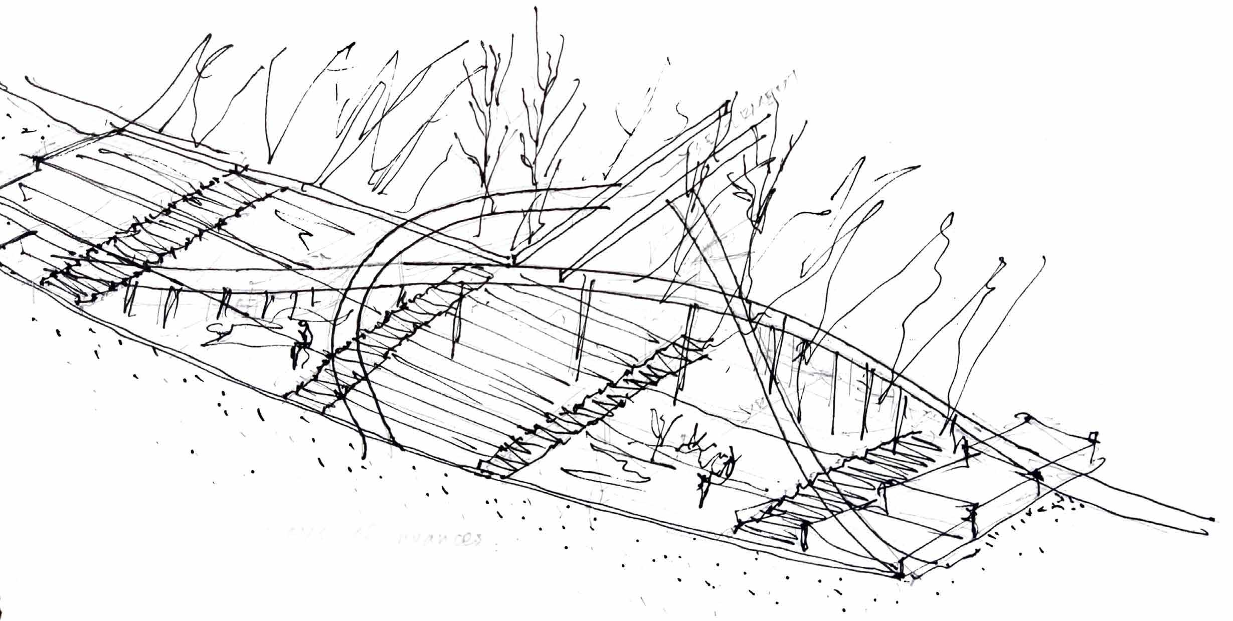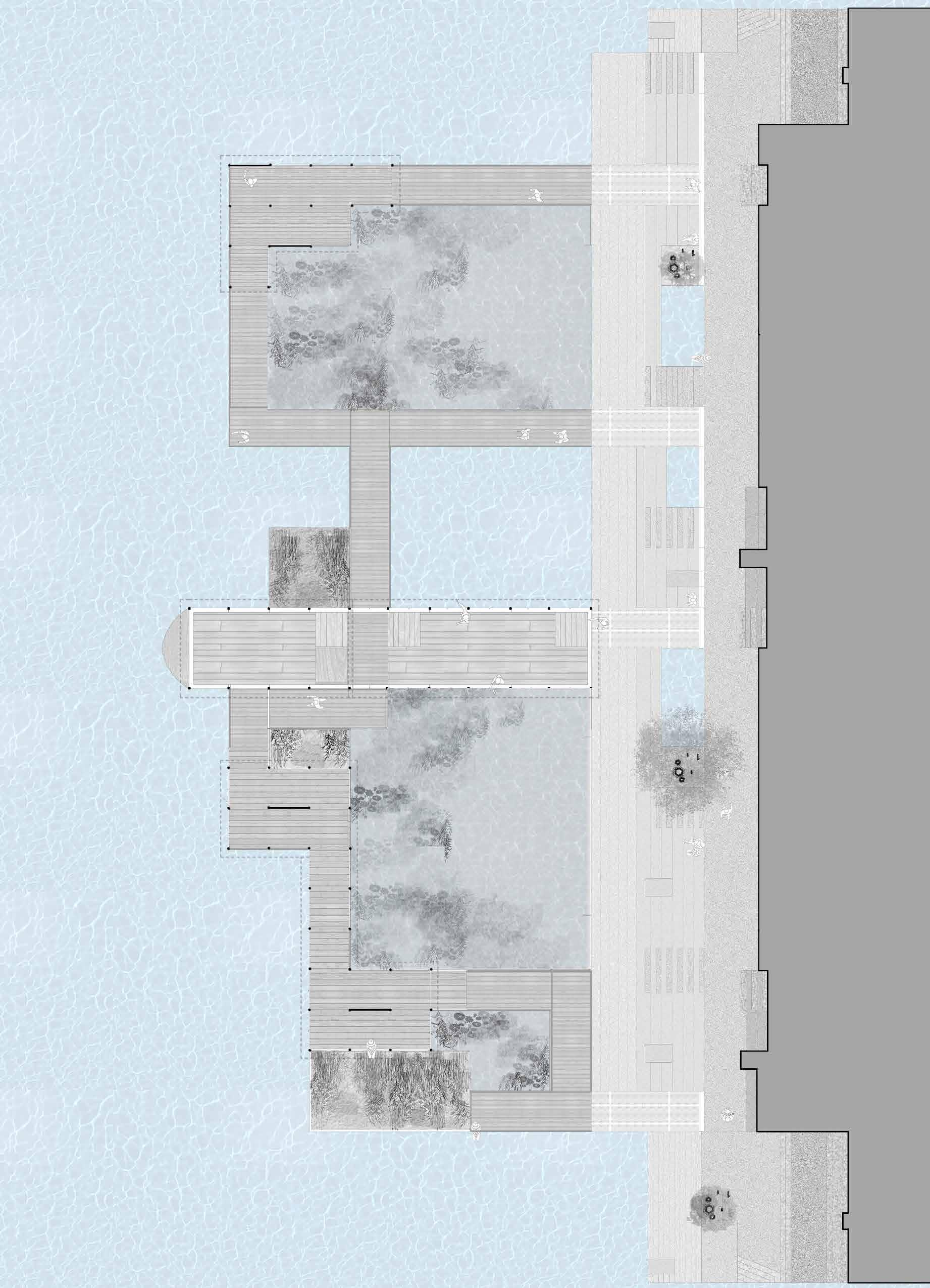 The experience of being inside a boat pavilion which looks over to more static form of biodiversity of lake on one side and more dynamic form of lake on other. The experience of walking with water .