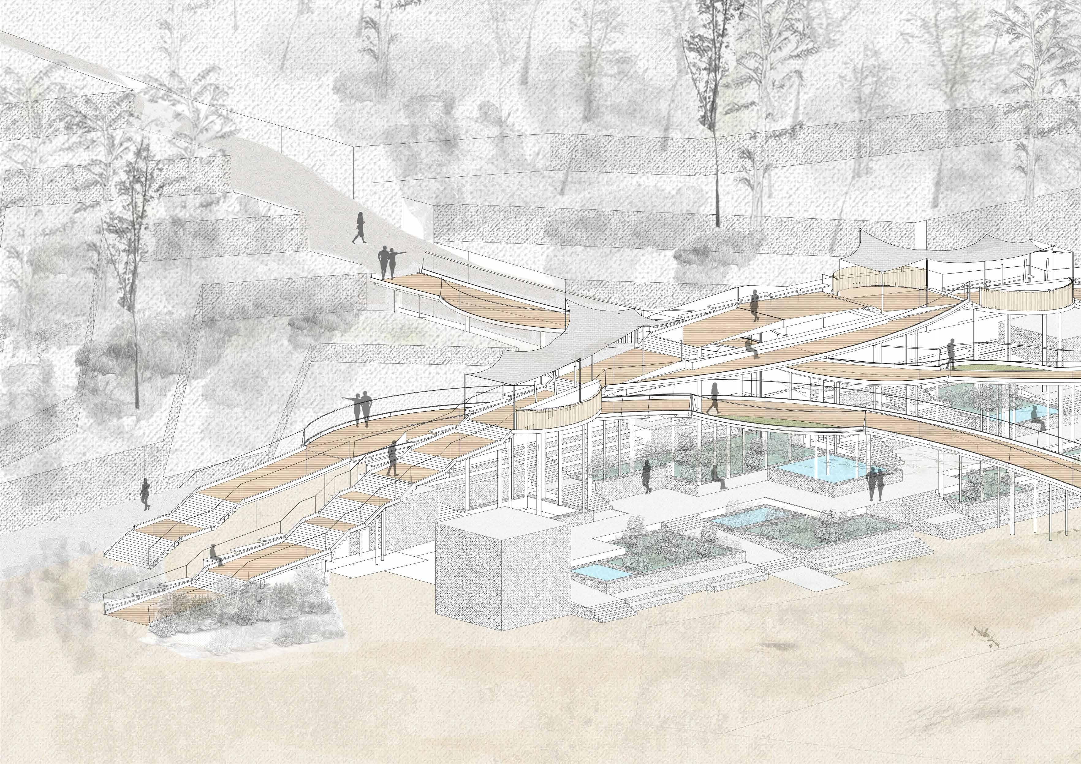 Having amphitheatre with reed bed spaces below which allows one to interact with the vegetation of reed beds and making the services part of the design. Along with it having admin spaces , washroom , bathroom and locker spaces along with a pumping/maintenance room to control the flow of water in the reed bed systems. Creating pausing spaces on the walkways along with sitting spaces. The walkways connect the surrounding in a way which makes the structure accessible for people walking along the jogging tracks and even for people living in settlements. Creating different levels in between walkways which will create different volumes of spaces in between and creating nuances like deck for a walkway becomes sitting spaces for another walkway. One of the walkways leading into the ocean where once can sit on the deck itself and experiencing the ocean..