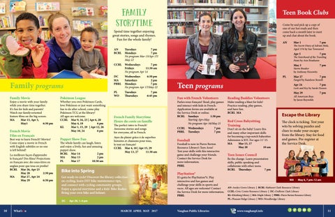 Parlez-vous français? Read, play games and interact with kids in French. Application forms are available at the Service Desk or online. BCRL Sundays 1:30 pm Starting Apr–May No program Apr 16/May 21 CCRL PBRL